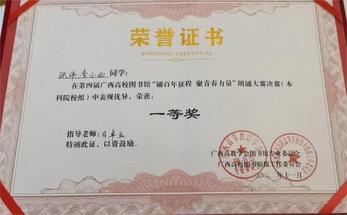11月18日-19日,第四届广西高校图书馆朗读大赛决赛在广西建设职业技术学院顺利举行。本次朗诵大赛由广西高教学会图书馆专业委员会、广西高校图书情报工作指导委员会主办,来自全区55所高校参赛,作品达16633篇,规模达到历届之最。参赛选手分本科组和高职组,我校动画与传媒学院学生张伟、李小雨同学代表学校参赛,他们在众多选手中脱颖而出,荣获本科院校组一等奖。