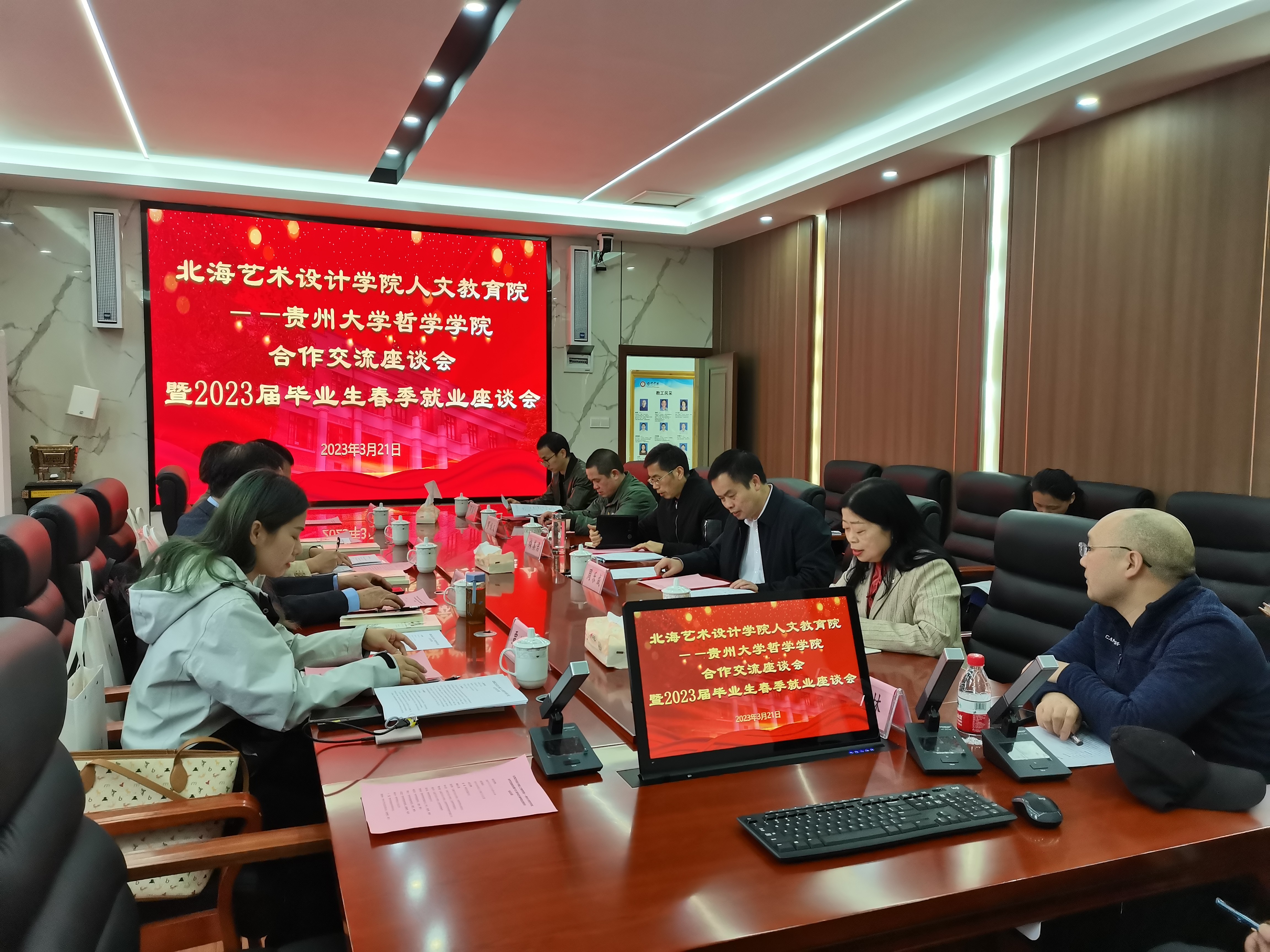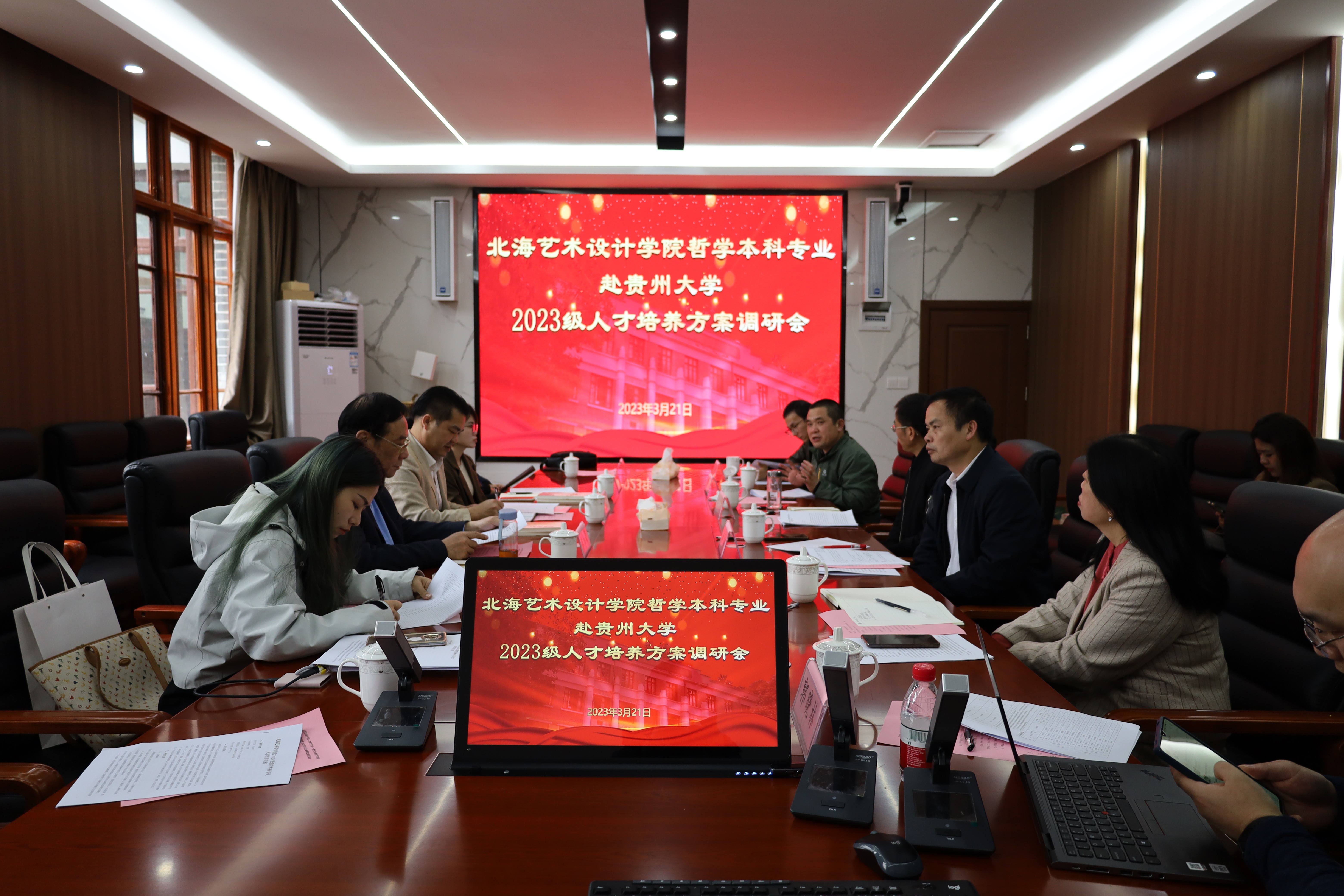 贵州大学哲学学院党委书记周乐成、院长陈艳波、副院长梅其君、贵州大学哲学学院教学督导等人对我校哲学学院领导和教师的来访表示热烈欢迎。2023级哲学人才培养方案调研座谈会中,双方围绕人才培养方案,学科建设,两校资源共享、交流互通的合作以及吸纳更多贵州大学优秀毕业生加入北海艺术设计学院等方面进行了深入的交流。