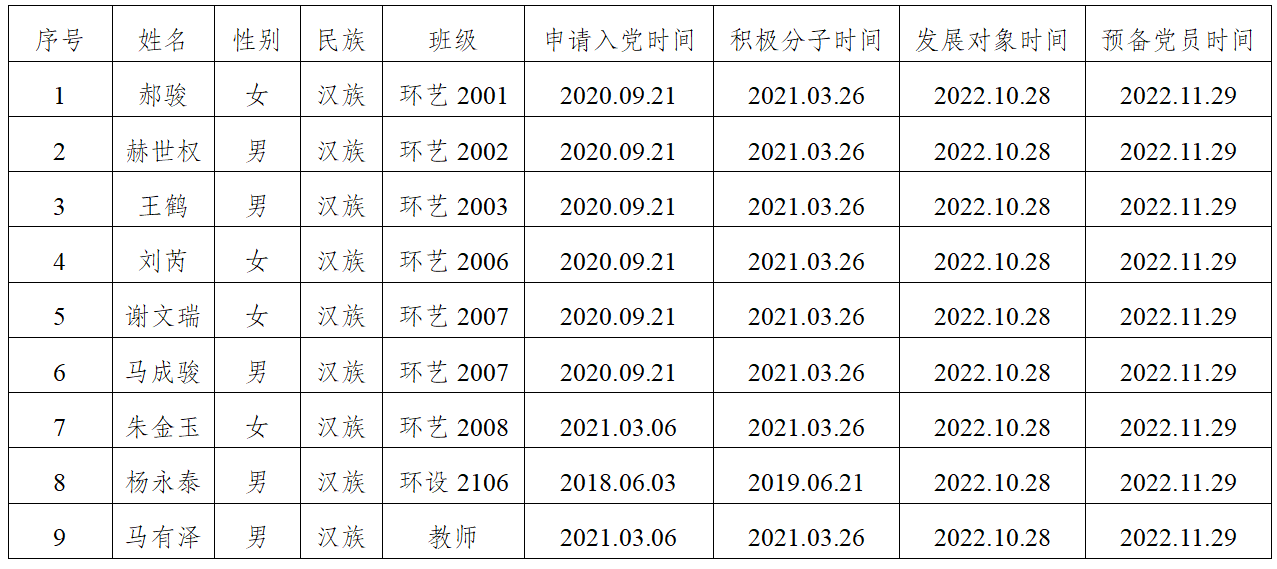 在征求党小组和党员、群众意见的基础上,经支部委员会审查,拟将郝骏等9位同志转为中共正式党员。根据发展党员工作有关要求,现将其有关情况公示如下,同志在预备期间表现良好。经党支部培养教育和考察,拟将郝骏等9位同志转为中共正式党员,并于近期召开支部大会讨论其转正问题。