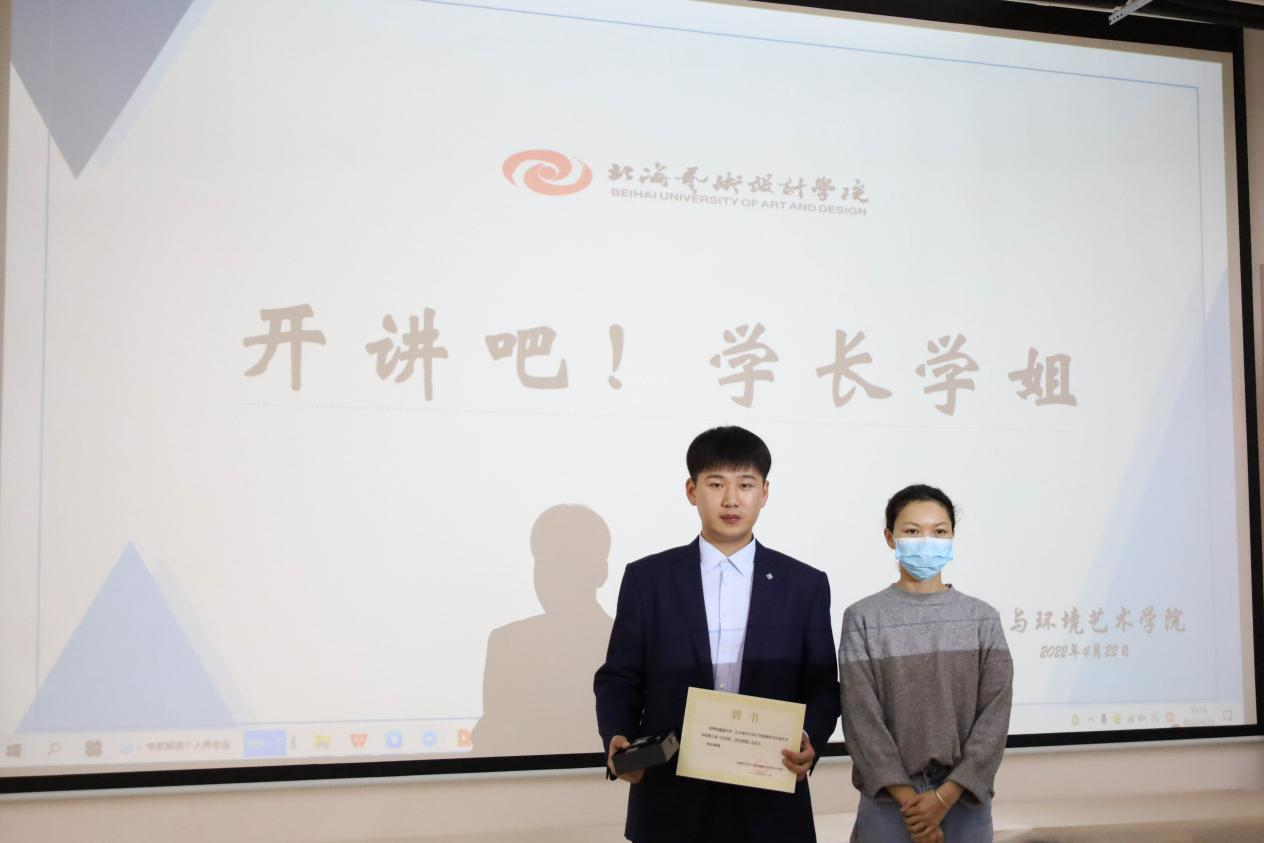 (会后,北海艺术设计学院校团委组织部部长陈文斌为主讲嘉宾李嘉皓颁发聘书)