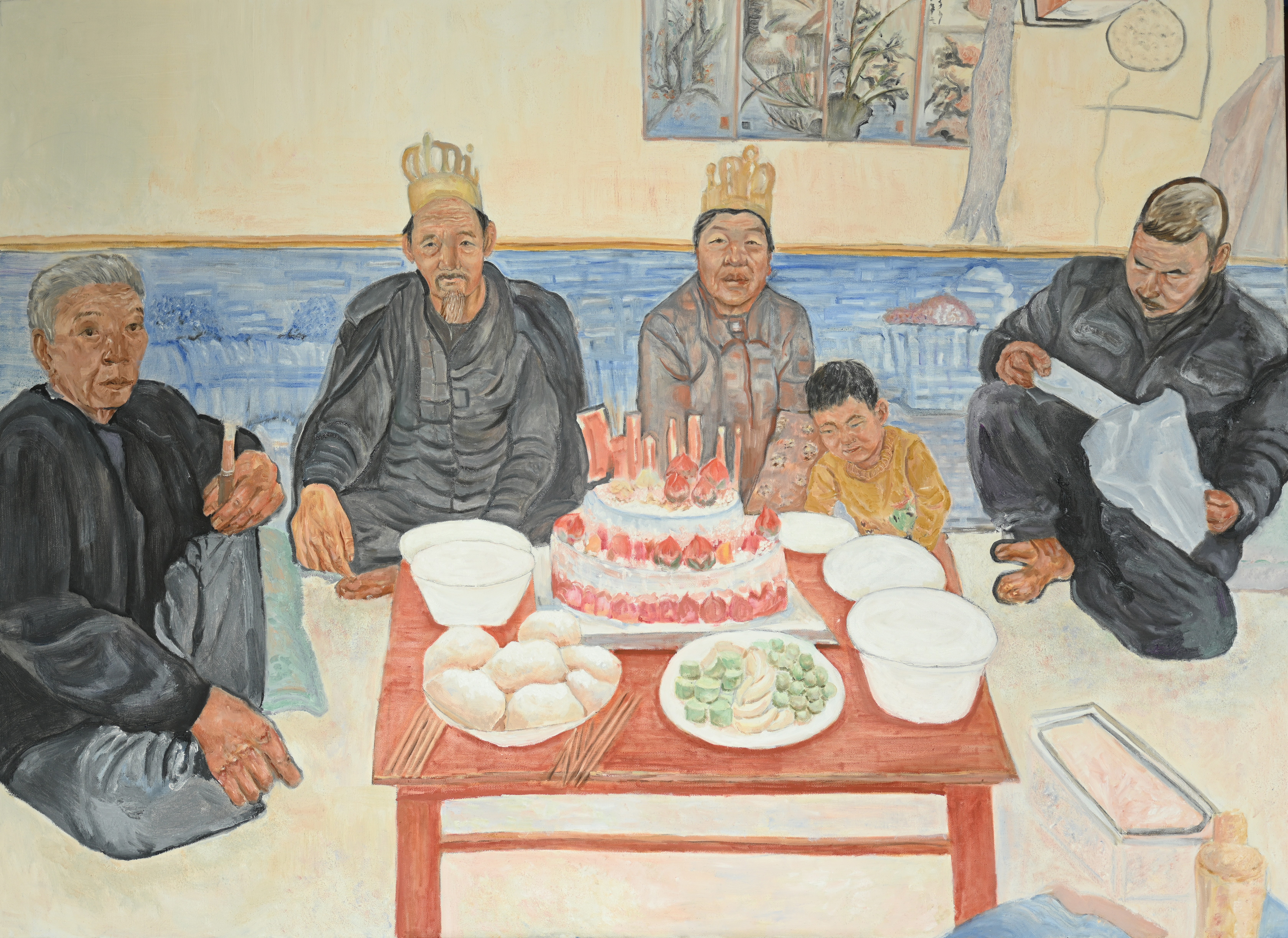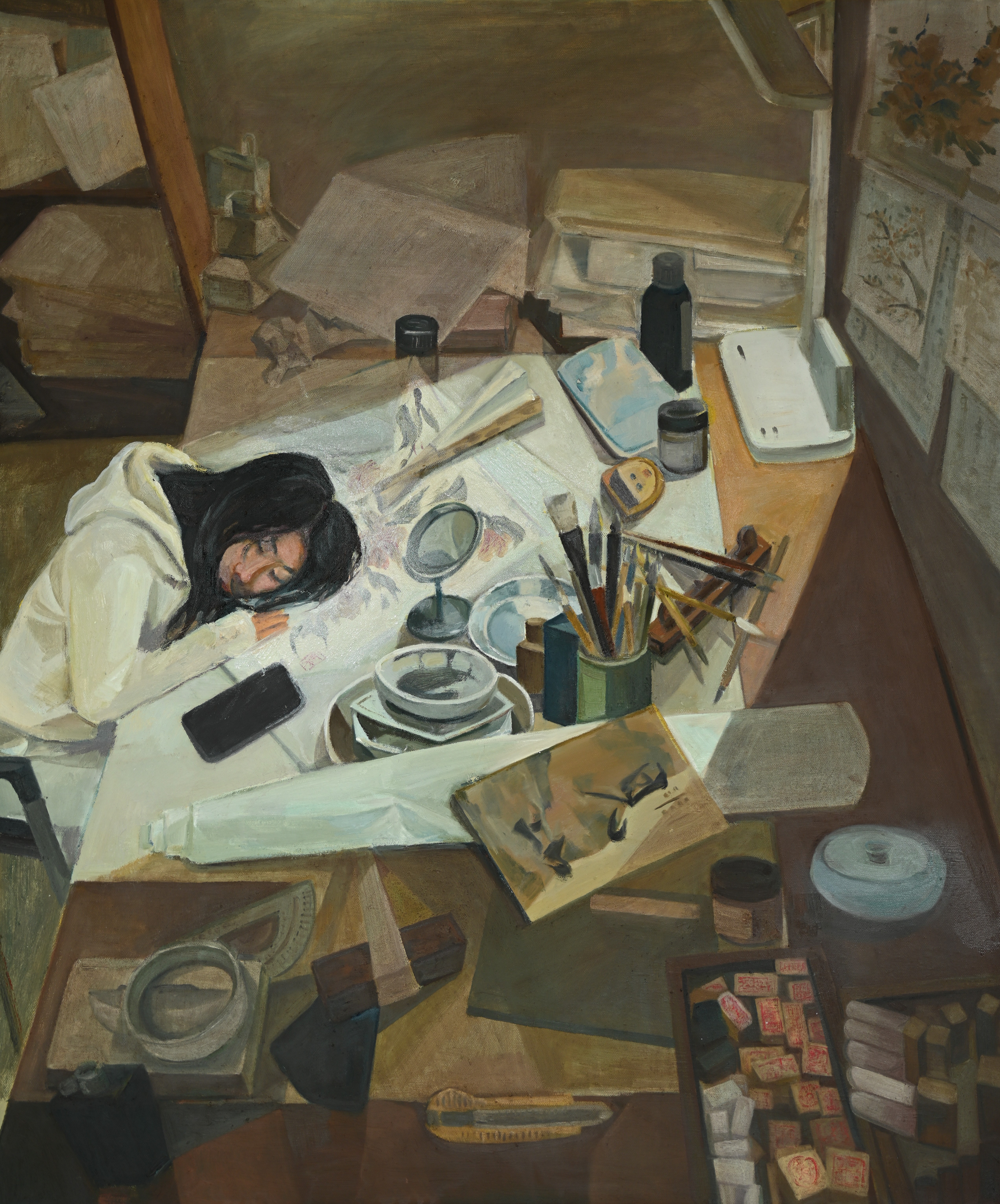 绘画2103班 冯越超 《茶韵时光:青春与岁月的碰撞》 120×120cm 指导教师:龚为、谢瑞