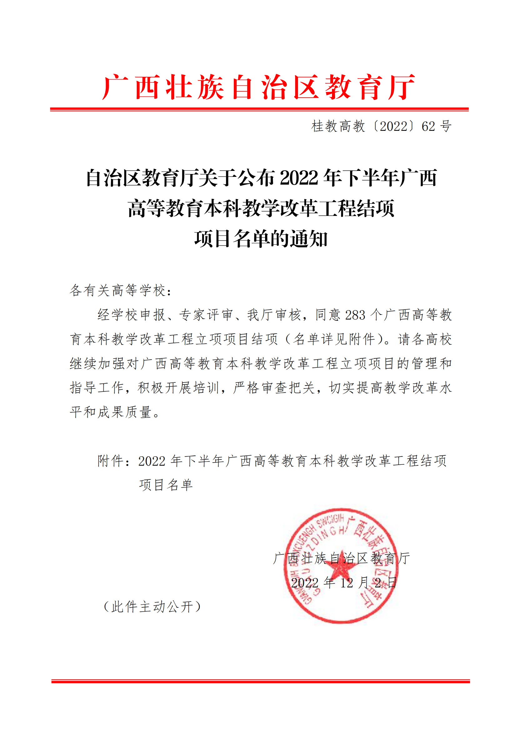 自治区教育厅关于公布2022年下半年广西高等教育本科教学改革工程结项项目名单的通知