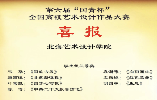 喜报,2022年12月第六届“国青杯”全国高校艺术设计作品大赛,数字媒体艺术学生,岳嘉强作品《国之风》获得学生组一等奖,缪怡轩《乐下谣》获得学生组二等奖,阙千骑作品《山居图》获得学生组二等奖,陈琦作品《中共二十大报告摘选》获得学生组三等奖,韦华作品《国韵古风》获得学生组三等奖,叶常凯作品《圆梦七巧板》获得学生组三等奖,刘宇昕,张智涵,凌可、施兴亮,任芸娴,刘骐瑞,李福年,王建龙,付若彤作品《红树林里的桥》获得优秀创作一等奖。刘宇昕、任芸娴,凌可、张智涵,付若彤、刘骐瑞,李福年、赵晨希,王建龙、宙卓,施兴亮、高薇淇作品《向海》获得优秀创作二等奖,周渺杉,林祥杰,黄恭康,龙江龙,周雅云,肖卓豪作品《党的一百年》获得优秀创作三等奖。