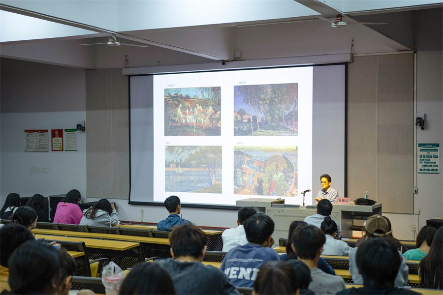 马振庆教授谈及有关色彩的文化内涵,他通过列举医院因颜色差异而造成人的心理差异、东西方对红色和黄色的不同态度两个鲜明的例子,让学生了解不同色彩的文化内涵,从而加深掌握颜色的文化寓意和象征。他还通过塞尚、高更、梵高的作品指出艺术设计是由复杂到简单的过程。在介绍中国风景画时,他建议同学们学习张钦若先生的意象画所表达的主观性特征和吴冠中先生对艺术的执着与探索的精神,在大量的艺术品鉴中养成自我艺术审美和品格。