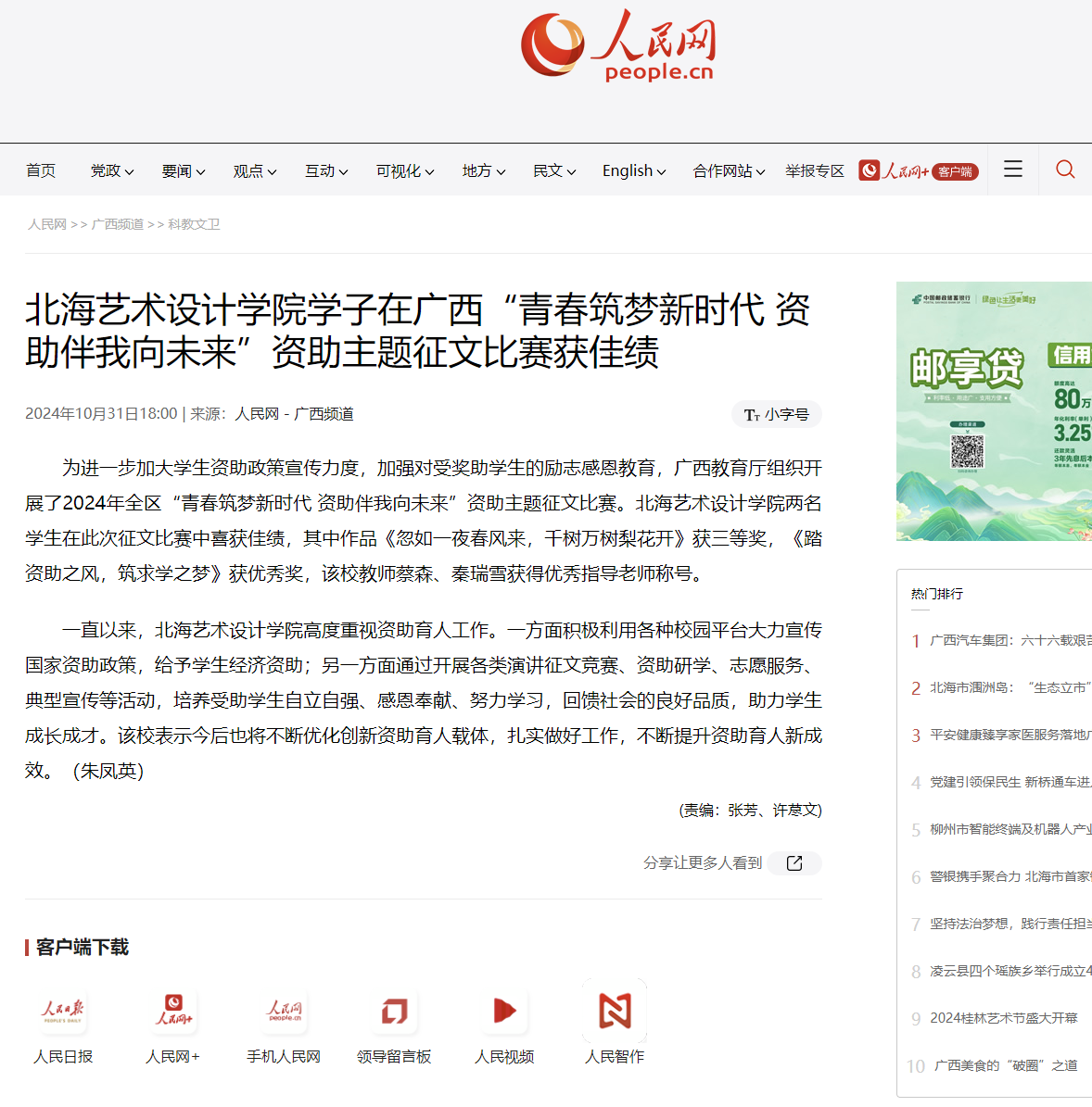 人民网:北海艺术设计学院学子在广西“青春筑梦新时代 资助伴我向未来”资助主题征文比赛获佳绩