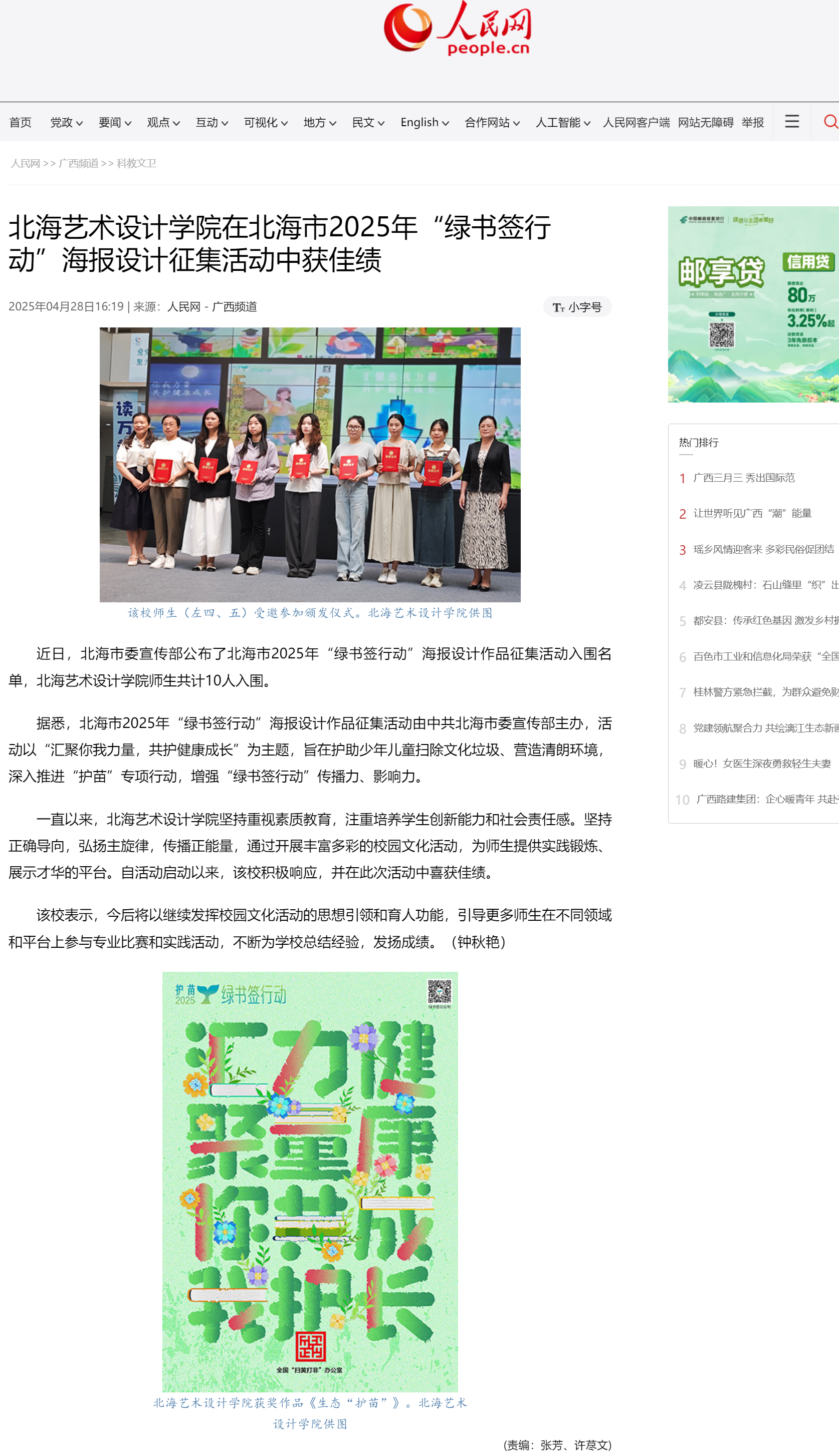 人民网:北海艺术设计学院在北海市2025年“绿书签行动”海报设计征集活动中获佳绩