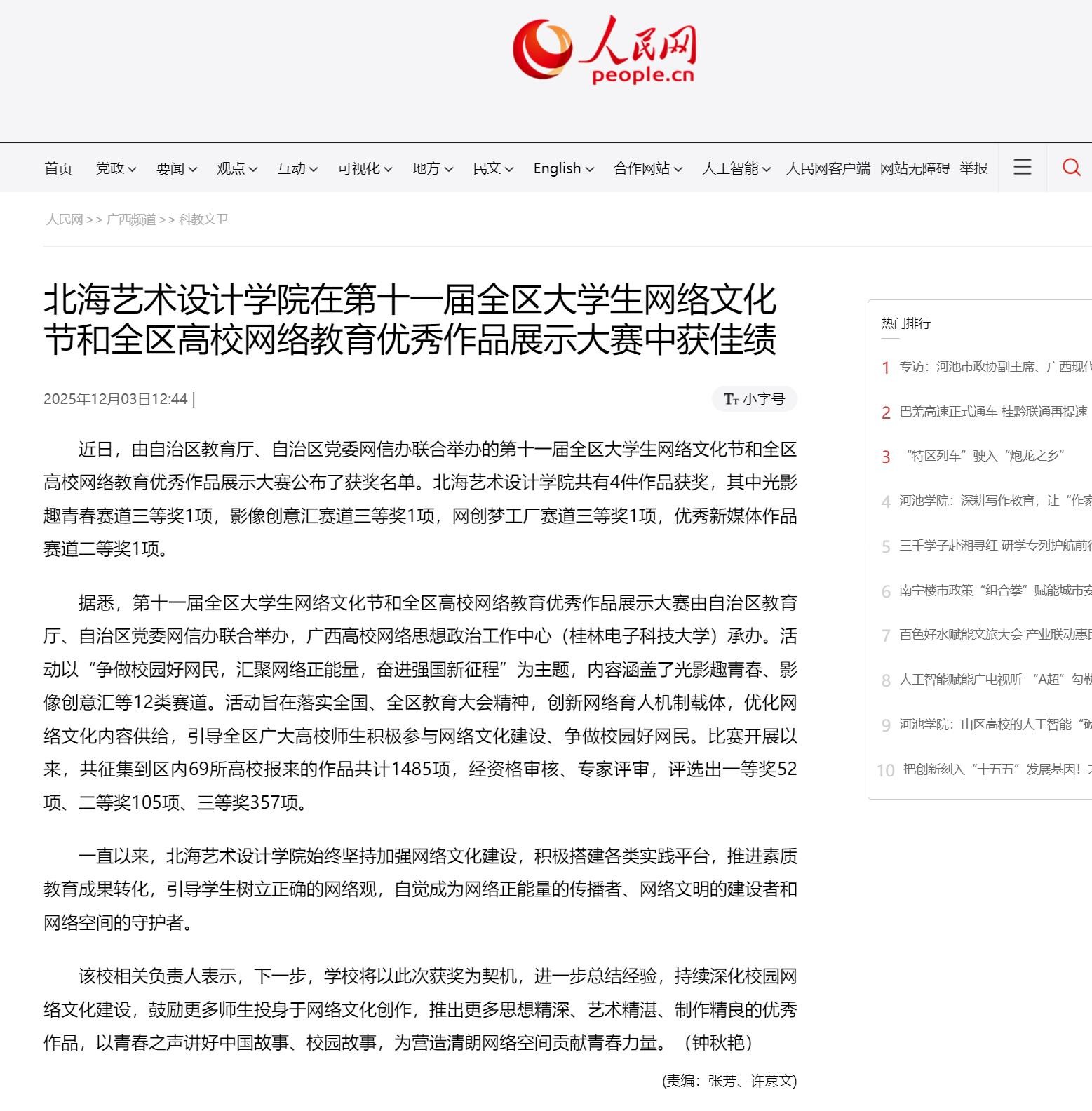 人民网:北海艺术设计学院在第十一届全区大学生网络文化节和全区高校网络教育优秀作品展示大赛中获佳绩