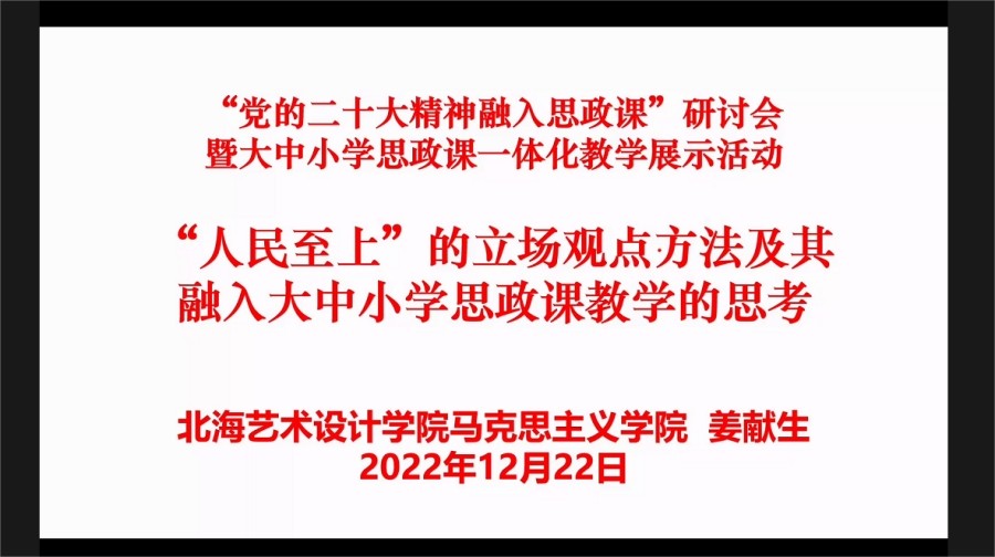 为进一步将党的二十大精神融入思政课教学,切实推动北海市大中小思政课一体化创新发展,12月22日上午,我院组织全体教师参加了由北海市教科所线上举办的“党的二十大精神融入思政课”研讨会暨大中小思政课一体化教学展示活动。活动议程包括开幕致辞、教学展示、研讨发言、主题报告、活动总结五个环节。我院长姜献生教授应邀作主题报告以及思政课教师苏李荧代表大学作教学展示。