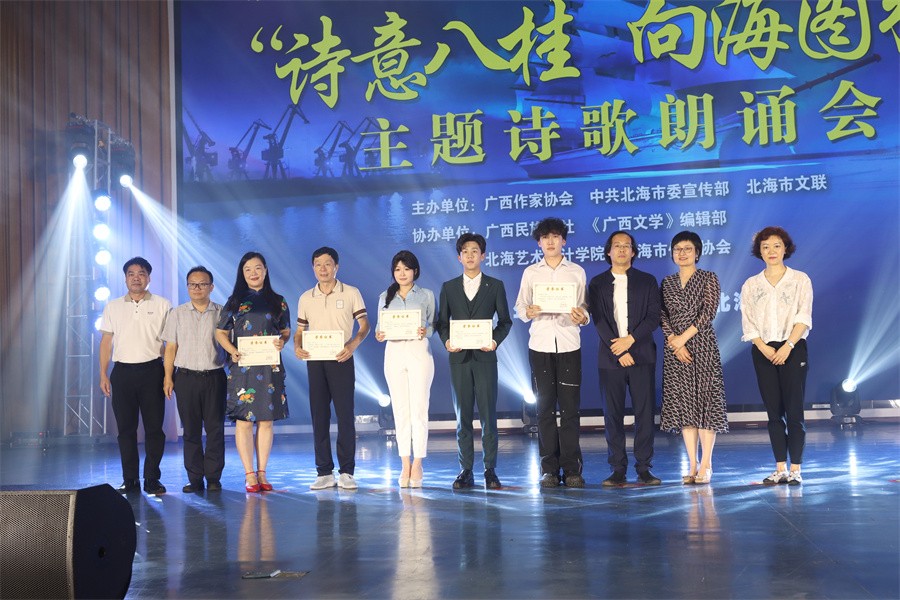 朗诵会上,朗诵者们深情朗诵了《红树林之诗》《向海而兴》《银滩》《我在侨港海滩看冠头岭的落日》《我把影子留给了海》等17首大气磅礴、积极向上的作品,用聚焦时代主题的文学创作,热忱描绘新时代壮美广西建设的多彩华章。
