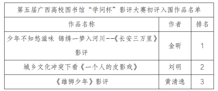 第六届广西高校图书馆"学问杯"影评大赛初评入围名单公示