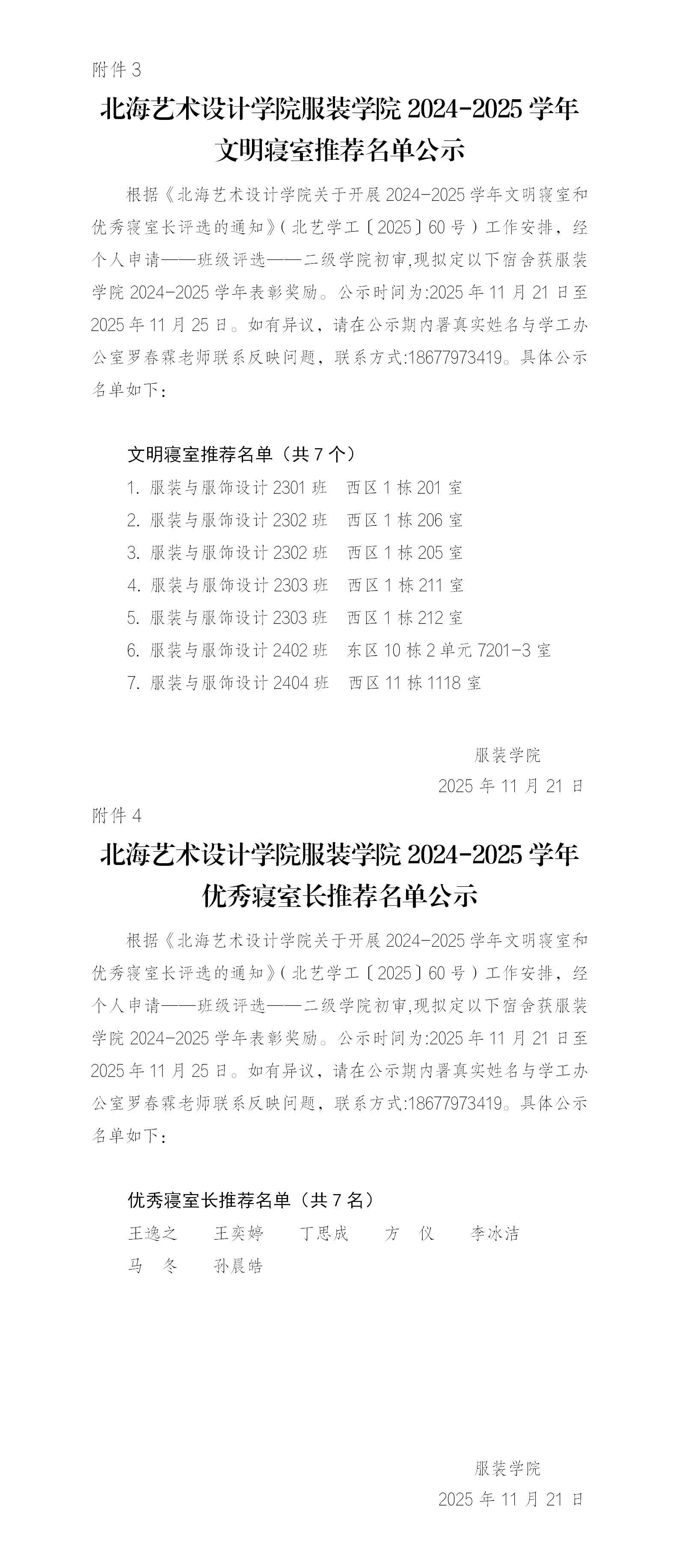 服装学院2024-2025学年文明寝室推荐名单公示