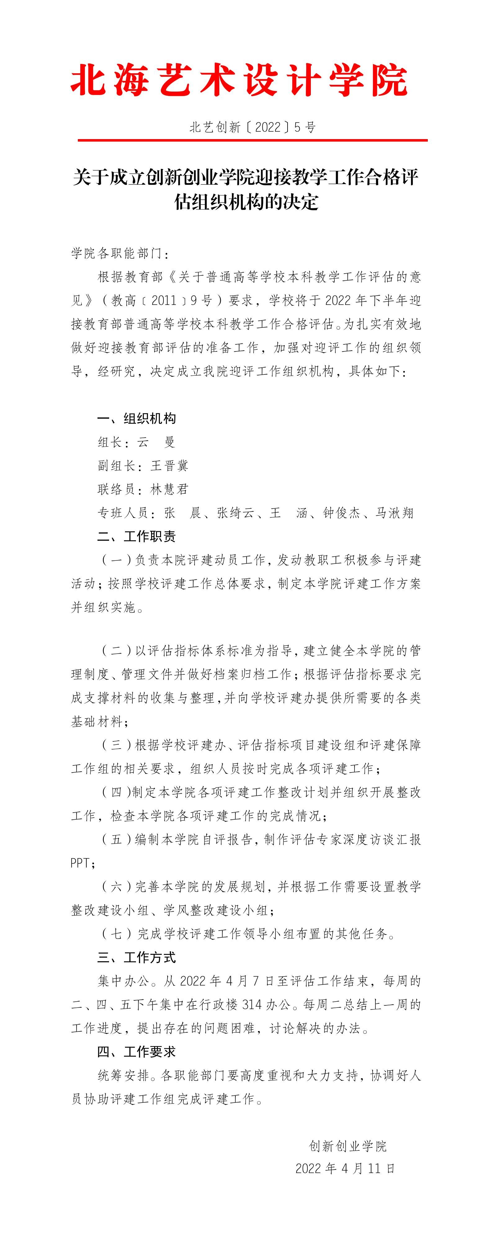 北艺创新〔2022〕5号 关于成立创新创业学院迎接教学工作合格评估组织机构的决定