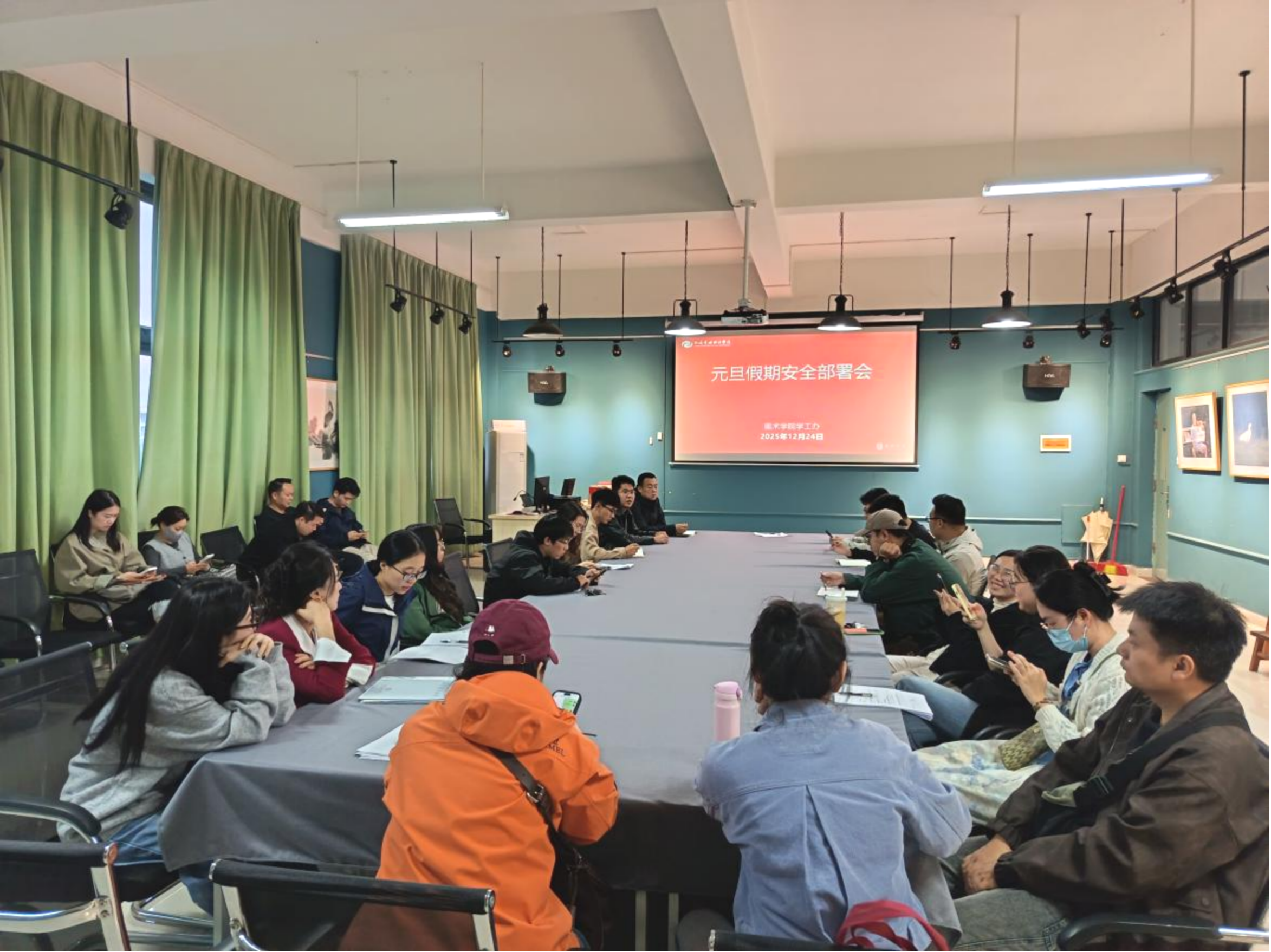 为确保全院师生度过一个安全、祥和的元旦假期,12月24日下午,美术学院学工办在艺术楼313召开专题工作部署会,学工人员及全体23-25级班级辅导参会,会议鲁明阳副书记和林昌华副院长共同主持,对假期各项安全工作进行了全面安排。
