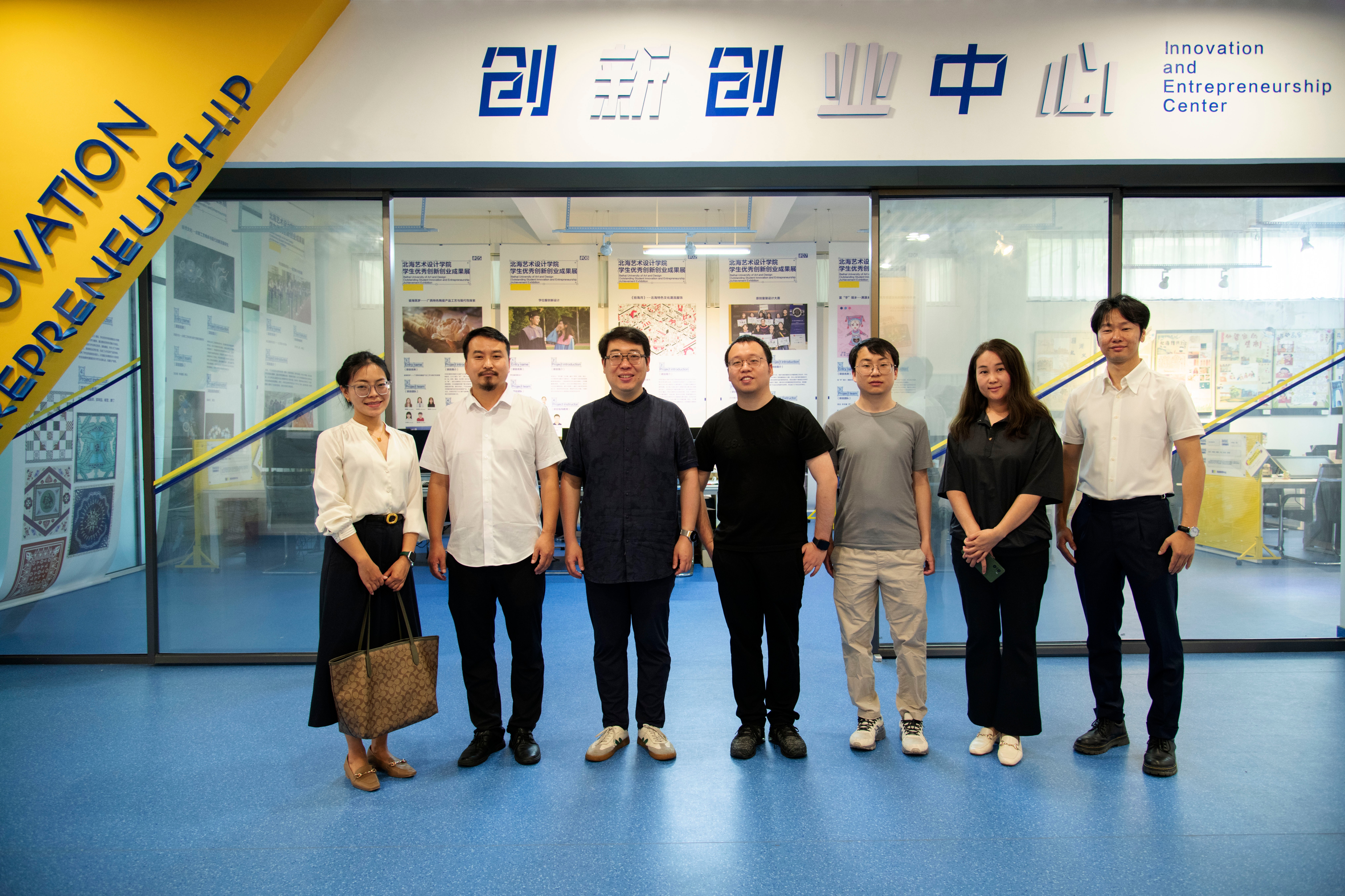 随后,在设计艺术学院院长李林平、创新创业学院院长云曼、实验室主任岳沛龙等领导老师的陪同下,UI中国、即时设计一行参观走访了创新创业学院,云曼院长结合展品展示了学院工作室、实验室建设,校企合作及实践教学成果等方面内容。