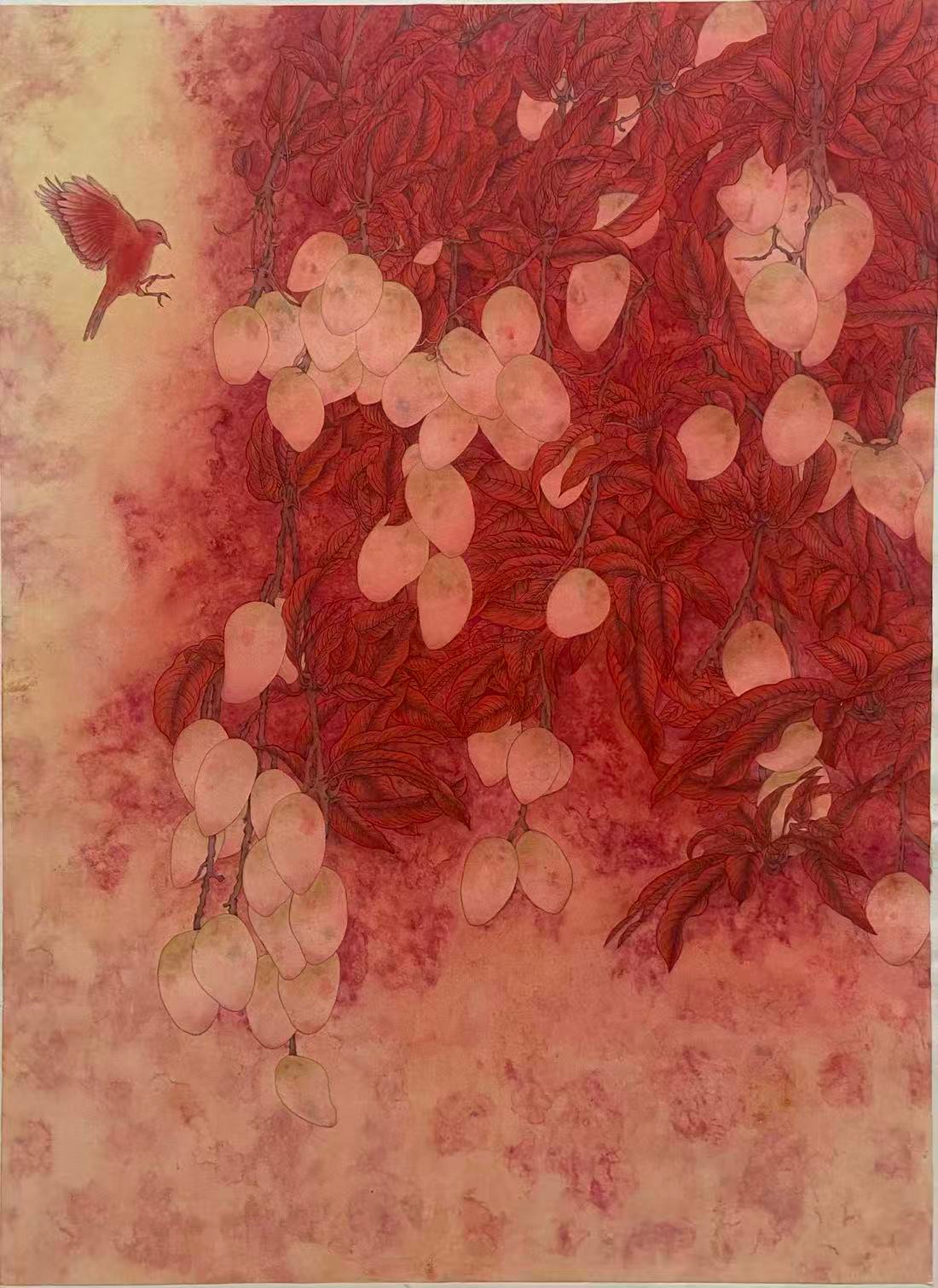 《金盘玉桃映素锦》岩彩29.7x42.0