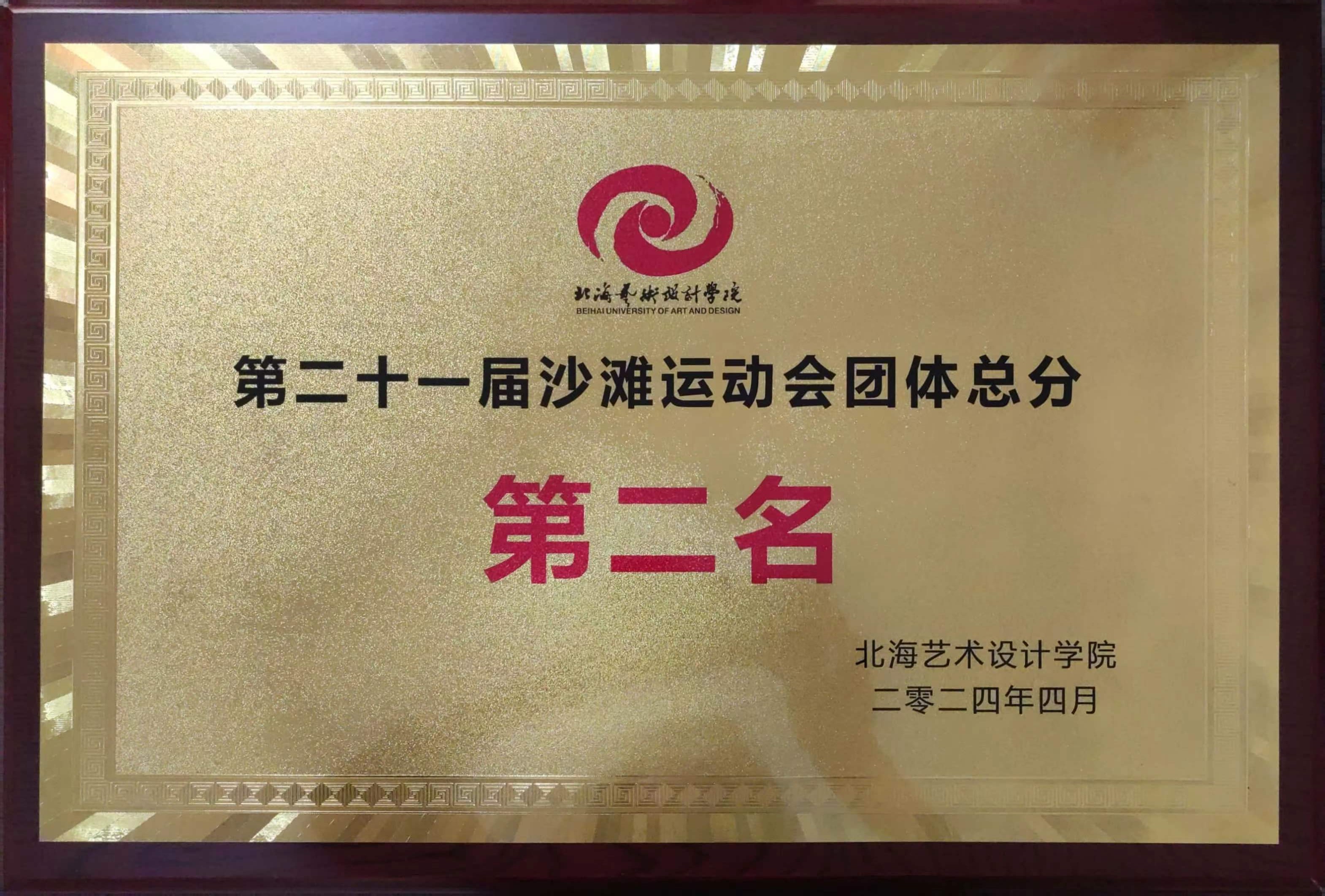 第二十一届沙滩运动会团体总分第二名奖状