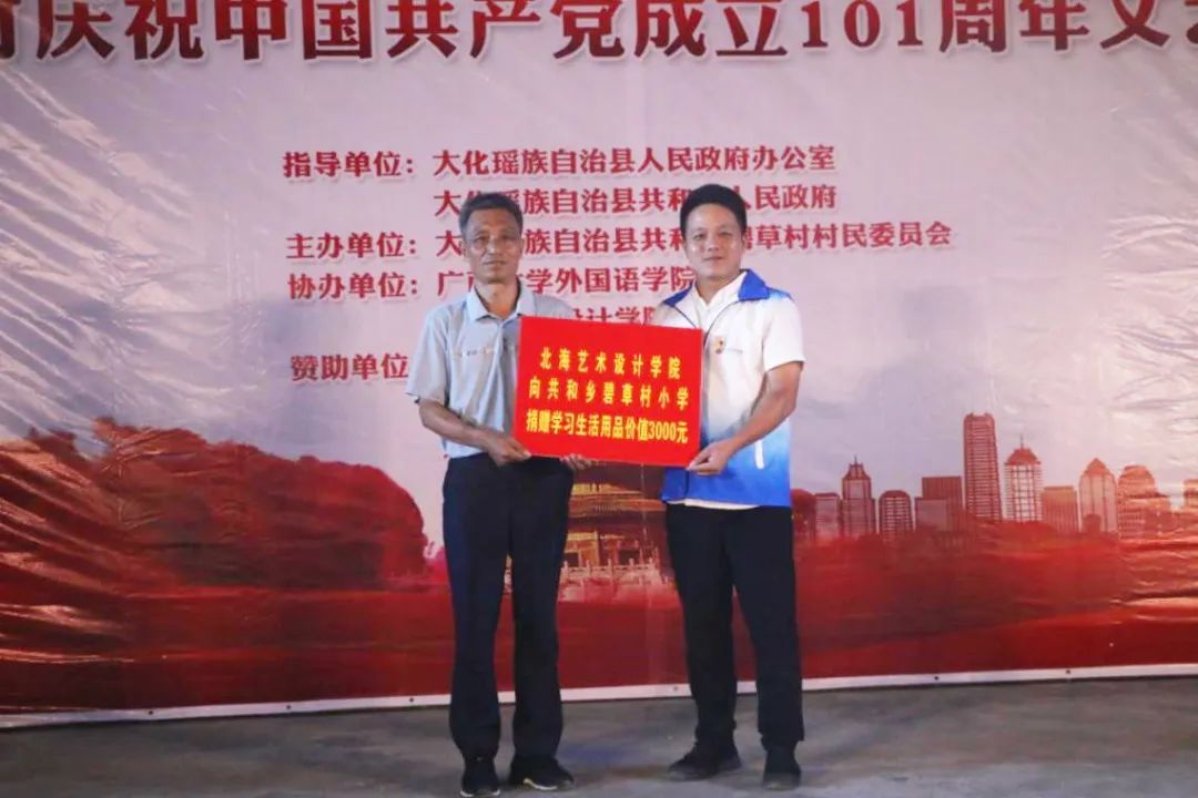 当天,服务团的成员们与当地政府部门、村民、及广西大学志愿者共同举办了“喜迎二十大,永远跟党走,奋进新征程”主题晚会。并向碧草小学捐赠价值3000元的学习用品及生活用品。