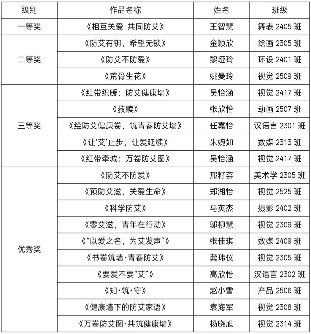 为广泛普及艾滋病防治科普知识,切实提升在校学生的防艾防护意识与社会责任担当,营造携手防艾的浓厚氛围,我校于2025年12月开展了以“万卷防艾图·共筑健康墙”为主题的防艾绘画作品征集活动。本次活动由校团委主办,校青年志愿者协会承办,爱心协会协办。 评审环节中,评委团围绕活动主题,从内容表达、创意呈现等方面开展专业评审,最终评选出思想性与艺术性兼备的优质佳作。 现公布“万卷防艾图·共筑健康墙”防艾绘画作品征集活动获奖名单,一起来看看有没有你的作品吧! 获奖名单 本次活动不仅切实提升了全校师生的防艾意识与自我保护能力,更推动了平等关爱、拒绝歧视的良好校园风尚的形成。在此,我们呼吁每一位师生都能成为防艾知识的传播者、平等关爱的践行者,从自身做起,用点滴行动守护你我健康,共筑温暖和谐的无艾校园!