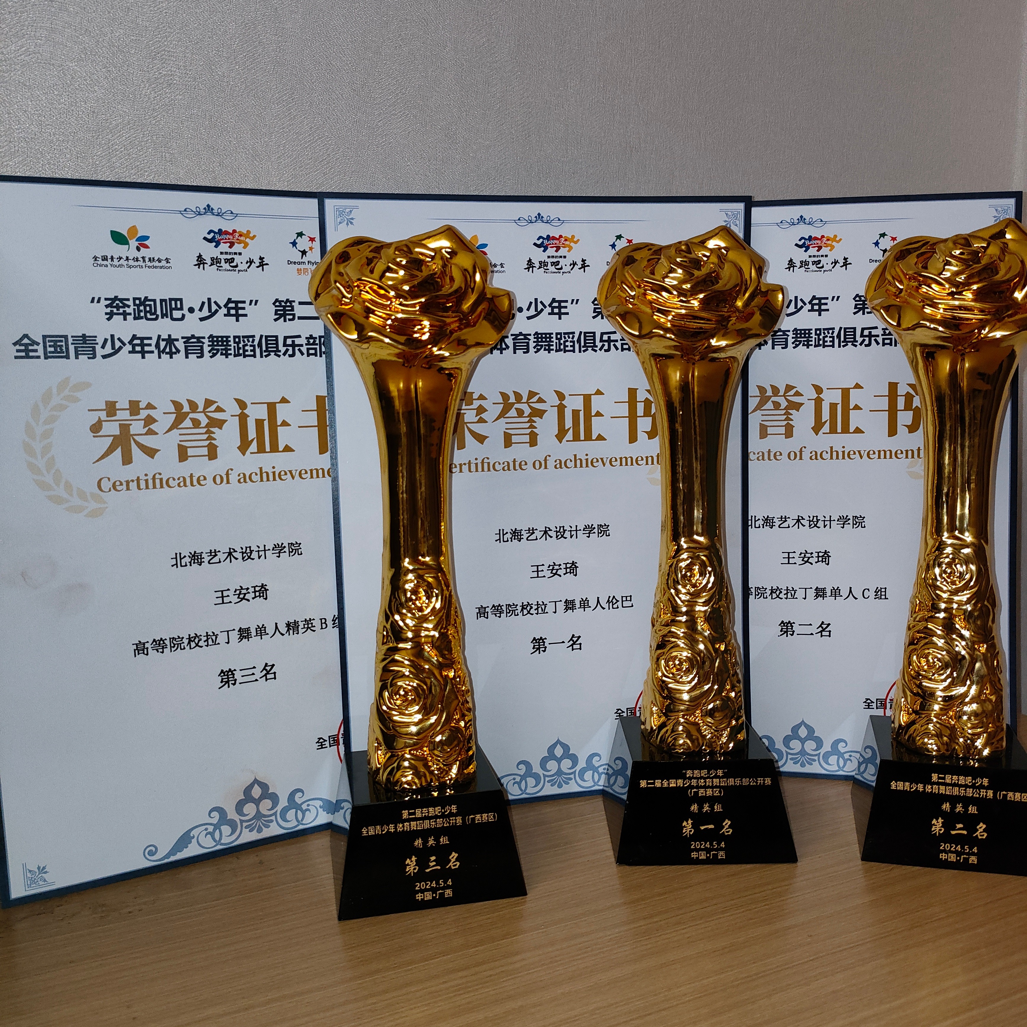 2024年5月4日,由全国青少年体育联合会举办的“奔跑吧·少年”第二届全国青少年体育舞蹈俱乐部公开赛,在广西南宁拉开帷幕。此次比赛是全国青少年体育联合会计划省级赛事的第二场,8月份将在湖南进行决赛。由我校人文教育学院舞蹈表演专业学生王安琦、动画传媒学院播音专业学生闵鑫、青年教师及本次大赛特邀评审周琦涵老师组成的代表队赴南宁参赛。经过激烈角逐,取得了高等院校单人B组第一名、高等院校单人C组第二名、高等院校精英B组第二名和第三名等多项骄人战绩。这是继2023年“劲舞红城 动感百色”全国⻘少年体育舞蹈节和CDMC 2023中国关工委体育舞蹈城市公开赛后,我校在同类赛事上再获佳绩。