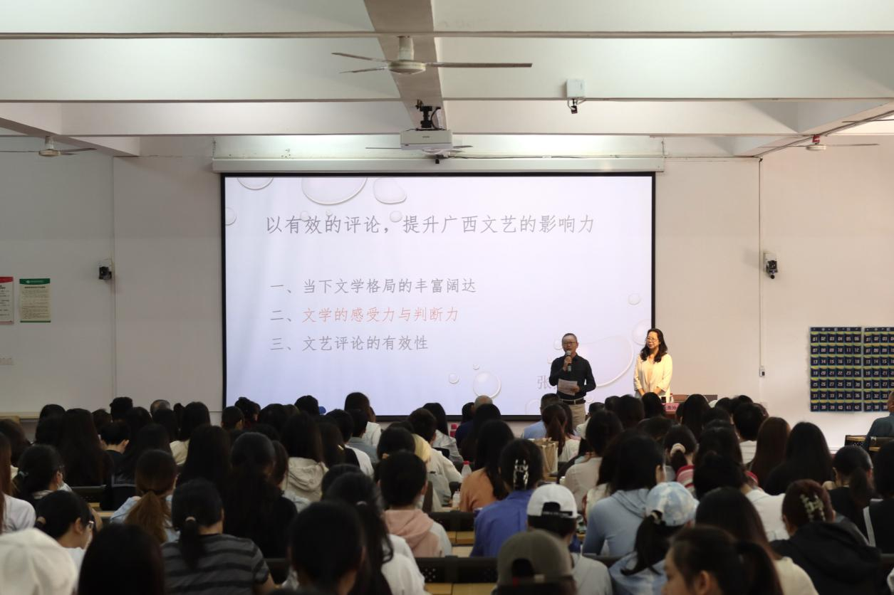 张主席还谈到了文艺批评有效性的问题。她表示,有效的批评,是批评家是否有艺术良知与担当精神的一个标志。文艺批评要讲真话、讲道理、有时代担当。讲座中,张主席还对当下以有效的文艺评论提升广西文艺的影响力和创造力做出了建议。认为应当关注广西文艺品牌,如文学桂军、漓江画派、八桂书风,应当建立广西文艺评论基地,并建议北海市和我校搭建完善的评论基地,以此锻炼学生的文学感受力和鉴赏力,提升广西文艺的影响力。