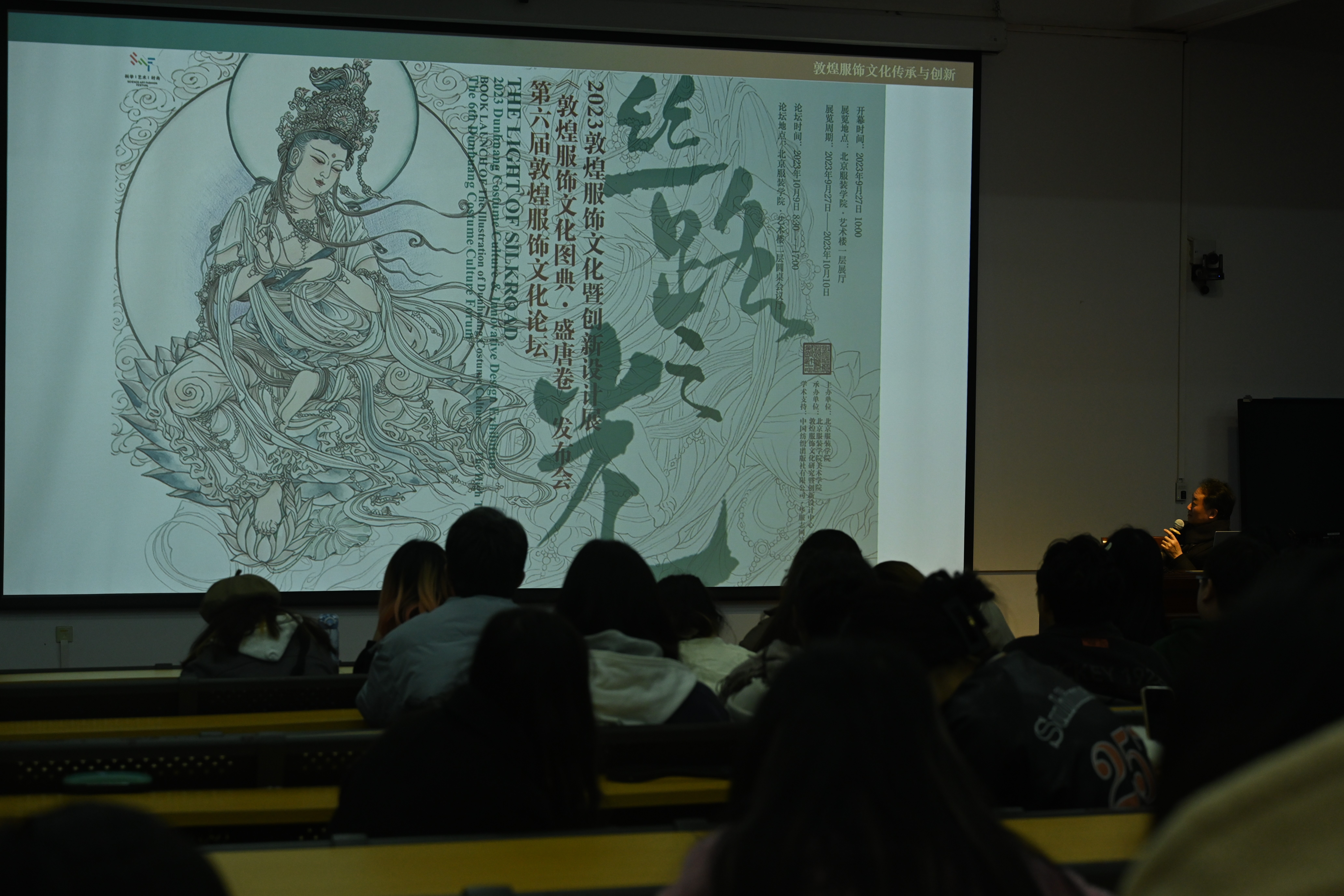 讲座过程中,刘元风教授现场介绍了经过多年前期铺垫后成立的敦煌服饰文化研究暨创新设计中心。敦煌服饰文化研究暨创新设计中心从学术研究、创新设计以及人才培养三个方面做出了众多重要工作。该中心创立了国家艺术基金“敦煌服饰创新设计人才培养项目”,做出了国家社科基金项目“敦煌历代服饰文化研究”和国家社科基金艺术重大项目“中华民族服饰文化研究”以及第六子课题“服饰文化传承创新研究”。在创立各个调研项目的同时,该中心不忘人才培养,加强创新发展的同时传播深层的中华民族优秀传统文化,让国家拥有优秀人才,让世界看见中华瑰宝。