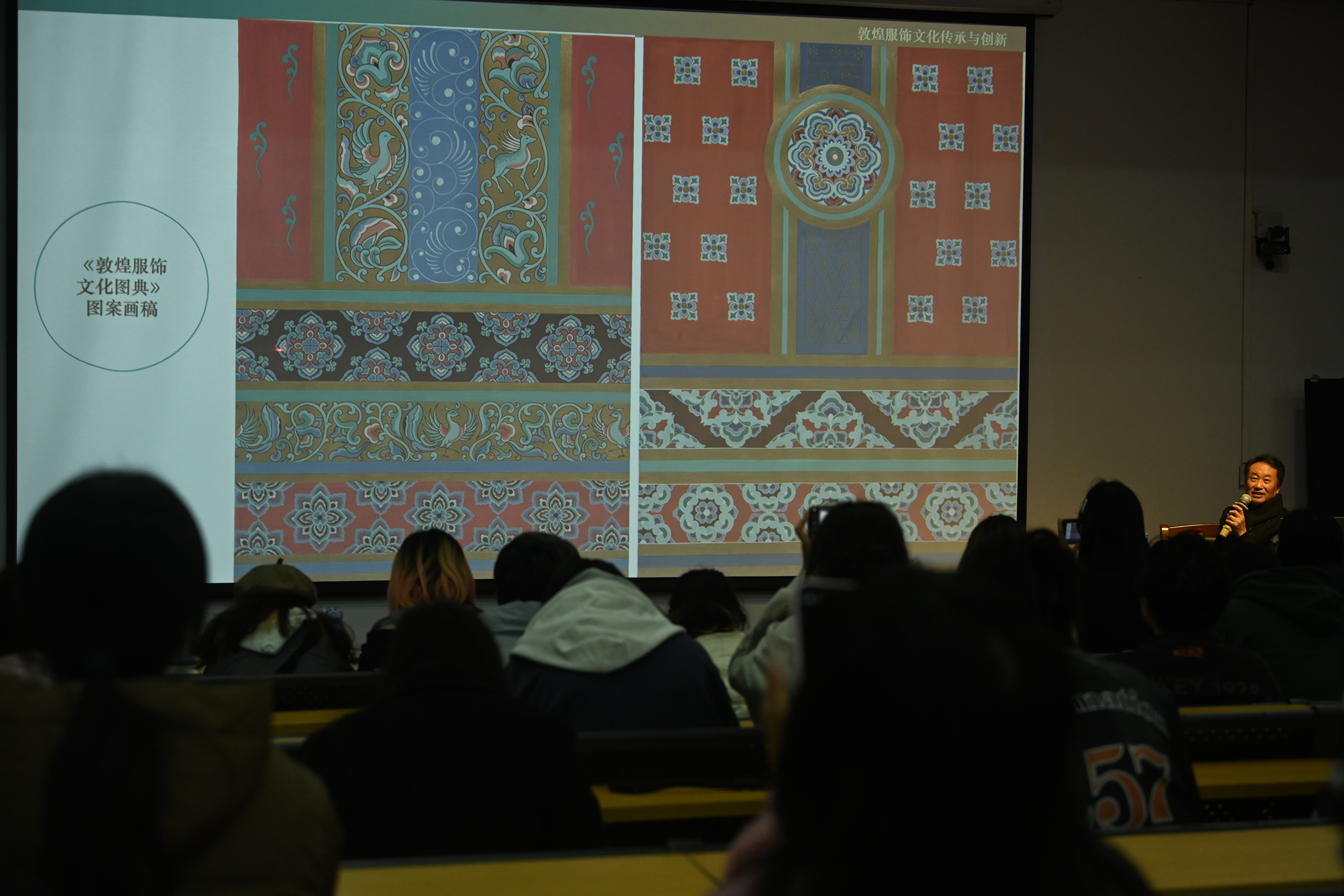 讲座伊始,刘元风教授以一张老照片讲述曾经求学的历程引入讲座内容。他通过展示与敦煌有关的图案以及敦煌彩窟菩萨裙饰在现代布料与现代服装上的应用,讲述他运用敦煌纹样设计的作品参加香港时装文化节,运用莫高窟盛唐第31窟藻井图案中的汲取元素所设计的工作服等丰富的工作经历,具体讲解了敦煌服饰的艺术与传承。