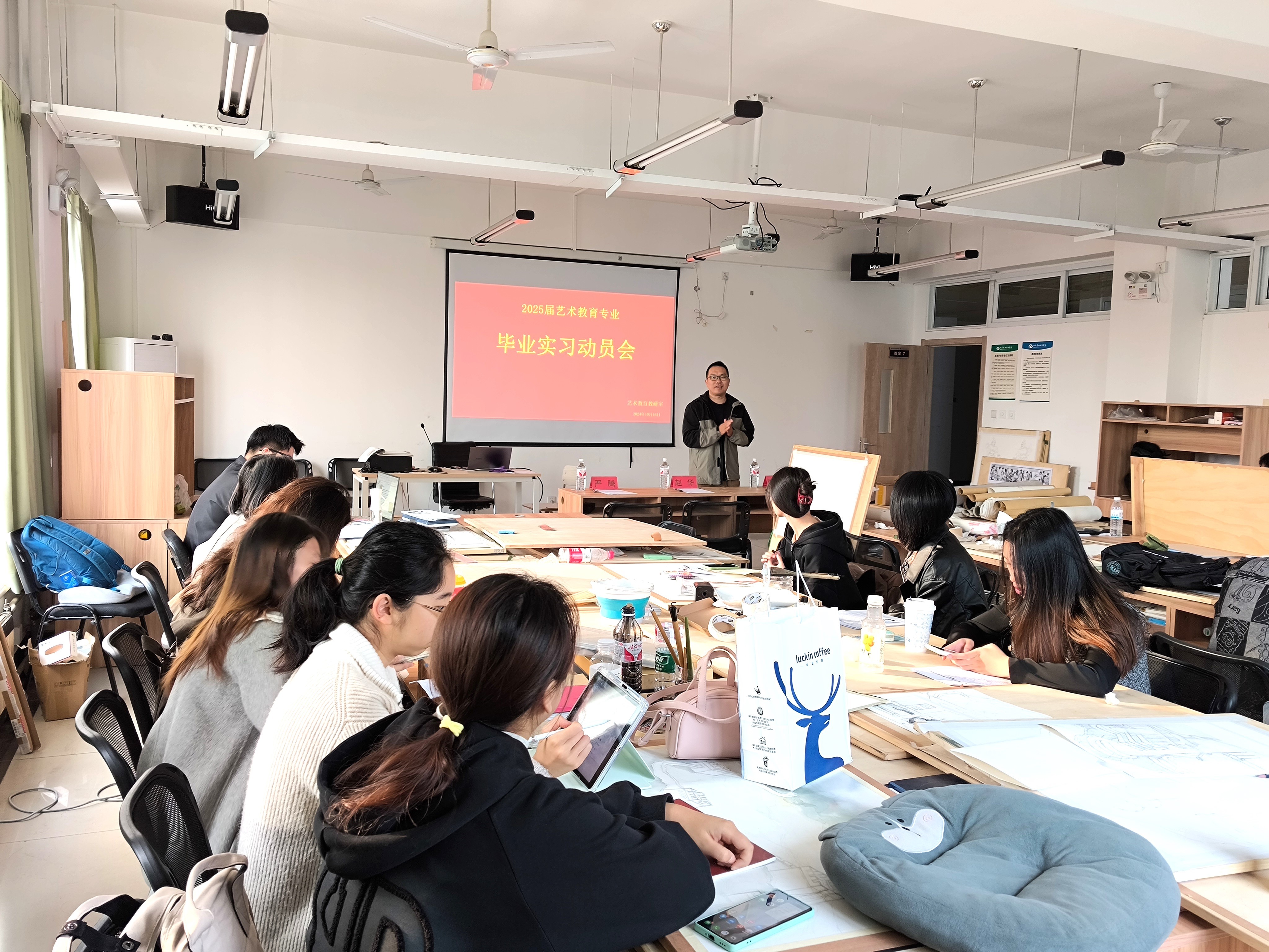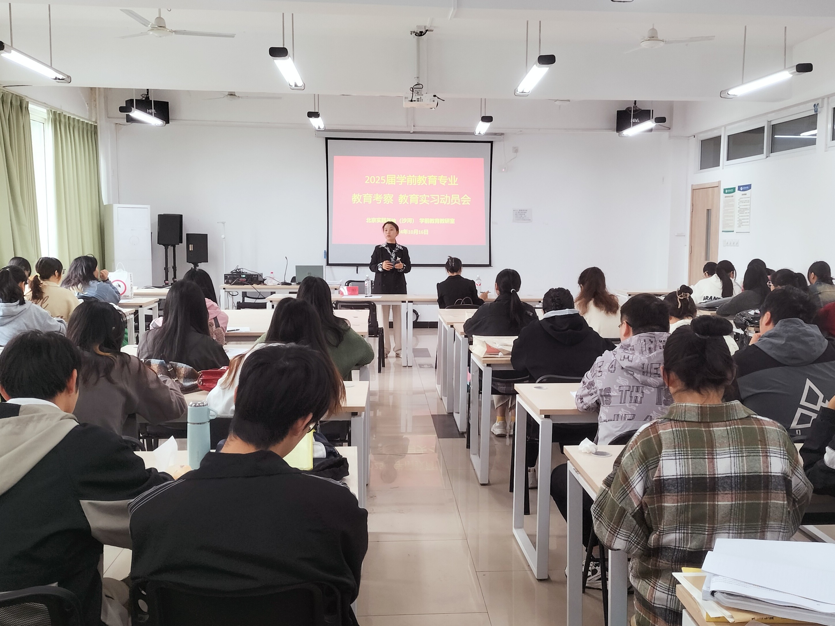 顺利推进2025届毕业生考察、实习工作,帮助学生明确考察、实习的目的、任务和重点,加强毕业生考察、实习期间的安全管理,确保相关工作有序开展。2024年10月16日上午,教育学院于北京实践基地205、207教室召开2025届毕业生教育考察、实习工作动员大会。教育学院副院长蒙剑英,学前教育教研室主任覃思,艺术教育教研室副主任周劲志出席会议,2021级艺术教育专业、学前教育专业全体学生参会。