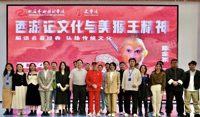 2024年12月5日,一级演员、中国著名表演艺术家六小龄童——章金莱老师受邀来到北海艺术设计学院,为全校师生带来主题为《〈西游记〉文化与美猴王精神》的精彩讲座。本次讲座由文学院主办,常务副院长梁镨文主持。