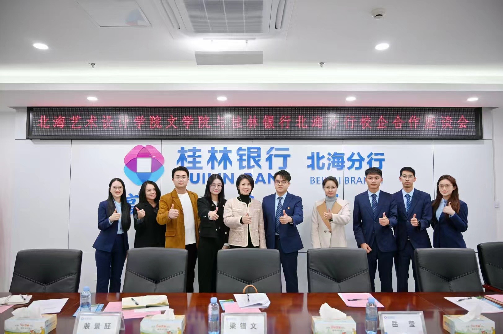 会前,我院一行由桂林银行北海分行人力资源部总经理杨季桦带领参观了桂林银行展厅,通过“实地看、现场学、互动谈”三步走模式,为后续合作奠定坚实基础。交流中,梁副院长讲到,在当今社会,高校与企业的合作日益紧密,这不仅是教育与经济协同发展的重要途径,也是培养适应社会需求人才的关键举措,希望能建立长期稳定的合作关系,通过资源共享、优势互补,实现双方在人才培养、科研合作、社会服务等多个领域的互利共赢,共同为地方经济社会发展贡献力量。通过此次走访,进一步了解桂林银行的用人标准和岗位需求,探索建立更加有效的人才培养和输送机制,为毕业生提供更多优质的就业岗位和职业发展机会,帮助他们顺利走向社会,走上工作岗位。
