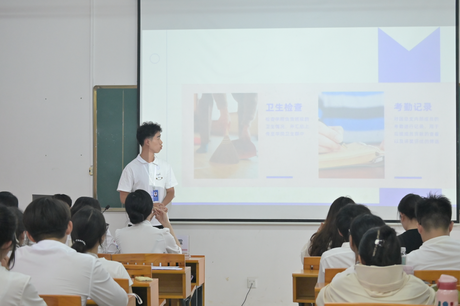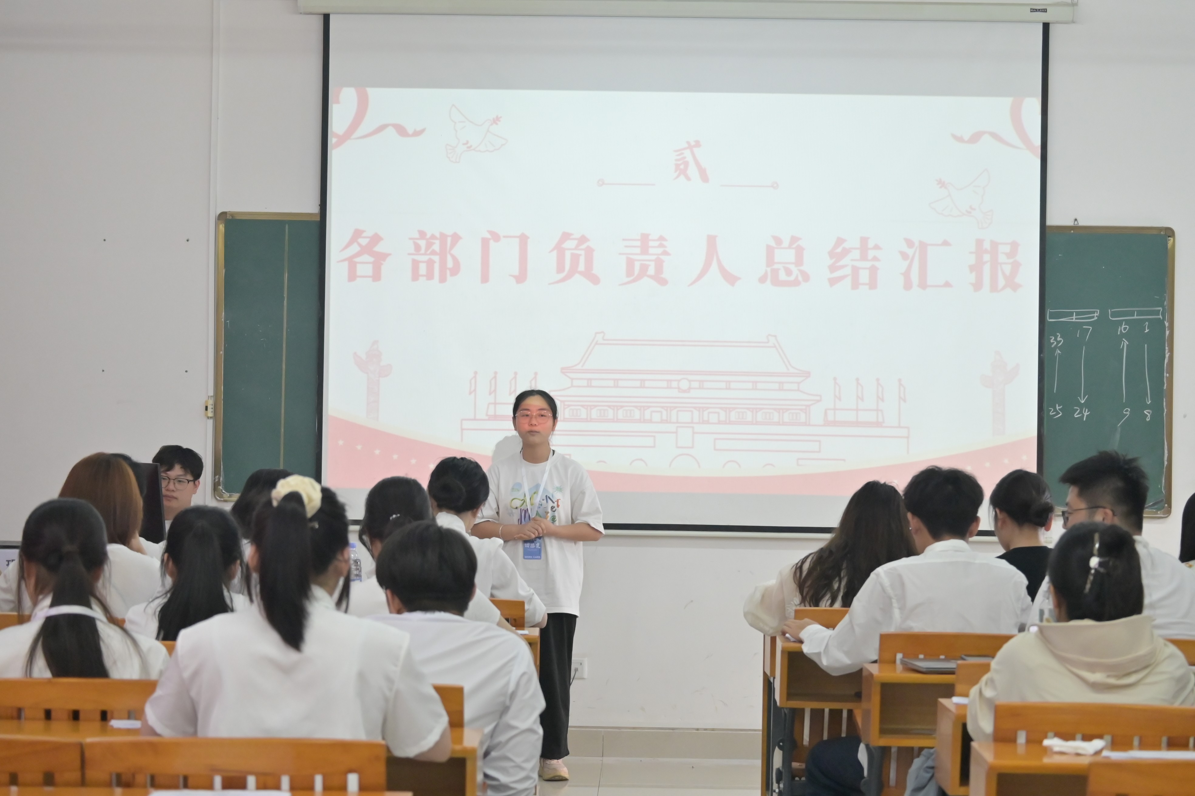 大会第二项议程,团总支各部门负责人总结汇报。团总支主席张佳巾总结了过去一年的工作,涵盖思想引领、组织建设和校园活动等方面,同时指出不足并提出期望。组织部汇报了团员发展和关系转出等工作内容;宣传部展示了邀请函和创意海报等成果;文体部分享了新闻稿撰写的相关要求和校园运动会等活动;纪检部强调了考勤监督和卫生检查的重要性。各部门总结了成绩与经验,分析了不足,并展望了未来工作。此次汇报使全体学生干部了解了过去一年的工作情况,为换届工作奠定基础,激励大家继续奋进。