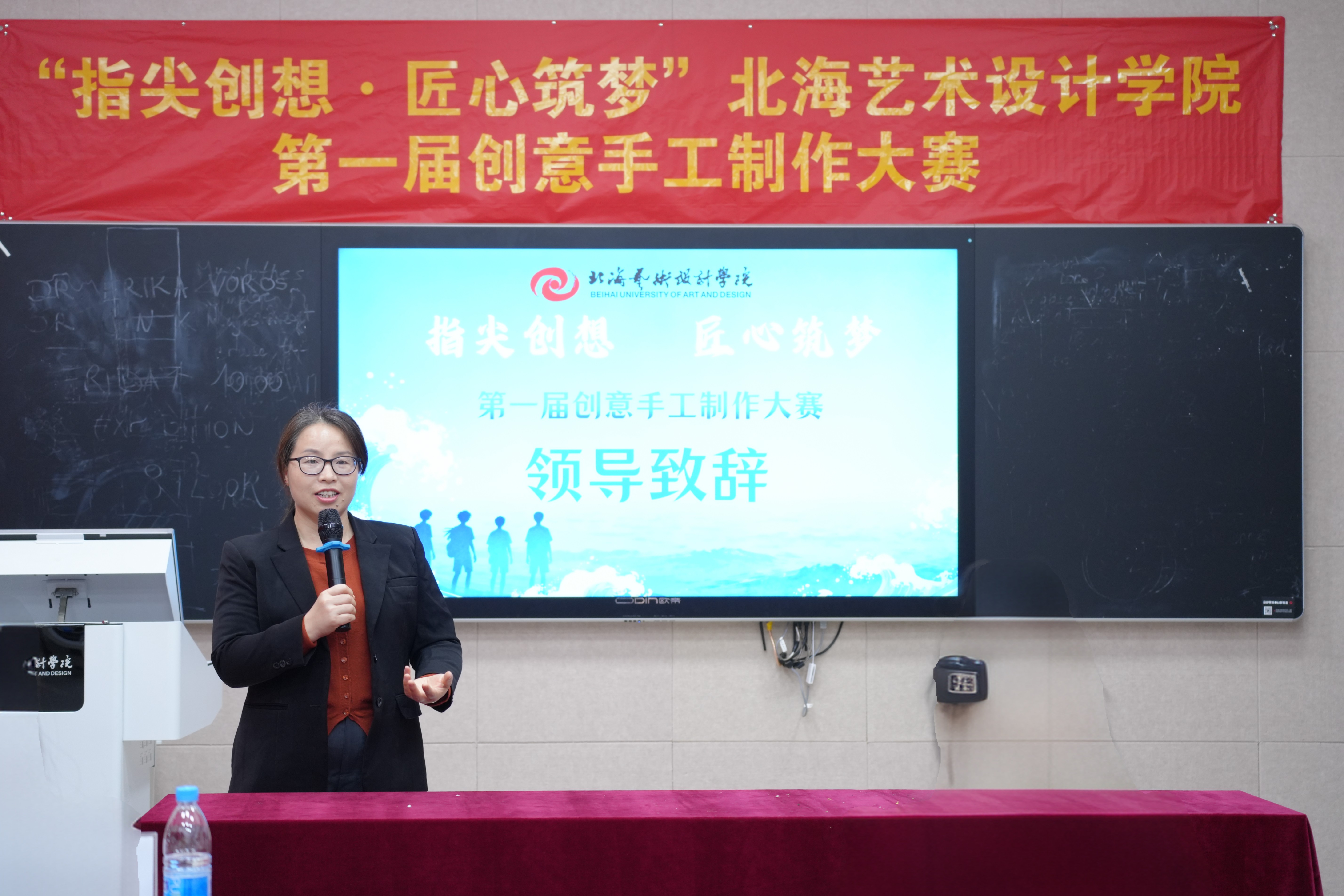 决赛正式开始前,教育学院院长熊秀峰发表致辞。她表示,本次大赛为学校各专业融合和交流提供了重要平台,是学校应用型人才培养的具体举措。她寄语学子坚守匠心、扎根北海本土文化,融入环保与科技理念,以赛促学、锤炼本领,展现北艺学子素养与担当,预祝选手取得佳绩。
