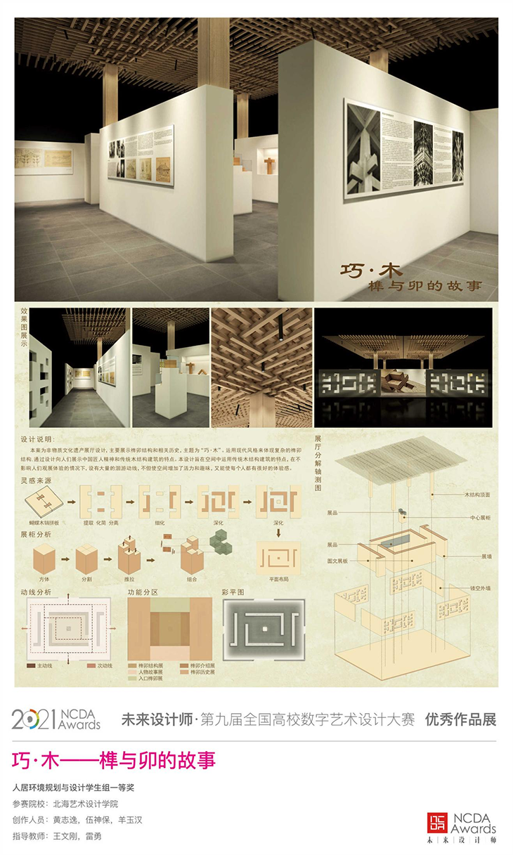 “未来设计师”全国高校数字艺术设计大赛由工业和信息化部人才交流中心主办的面向高校在读大学生及教师的全国性大赛我院黄志逸同学、伍神保同学、羊玉汉设计的巧·木——隼与卯的故事为非物质文化遗产展厅设计,主要展示榫卯结构的相关历史,主题为“巧木”。运用现代风格来体现复杂的榫卯结构,通过设计向人们展示中国匠人精神和传统木结构建筑的特点。设计旨在空间中运用传统木结构建筑的特点,在不影响人们观展体验的情况下,设有大量的洄游动线,不但使空间增加了活力和趣味,又能使每个人都有很好的体验感。