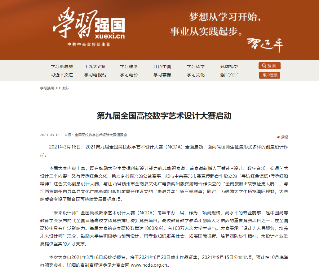 全国高校数字艺术设计大赛(未来设计师NCDA大赛)为艺术设计领域的高水平知名赛事,是大学生积极参与、具有广泛影响力的专业赛事之一,为大学生参与设计创新的重要平台。大赛秉承“设计为人民服务,培养未来设计师”的理念,坚持艺术与技术并重、学术与公益并重,引导大学生将专业知识服务于社会,提升大学生的设计创新与实践能力,拓展国际视野及团队协作精神,成为未来的主力设计师。