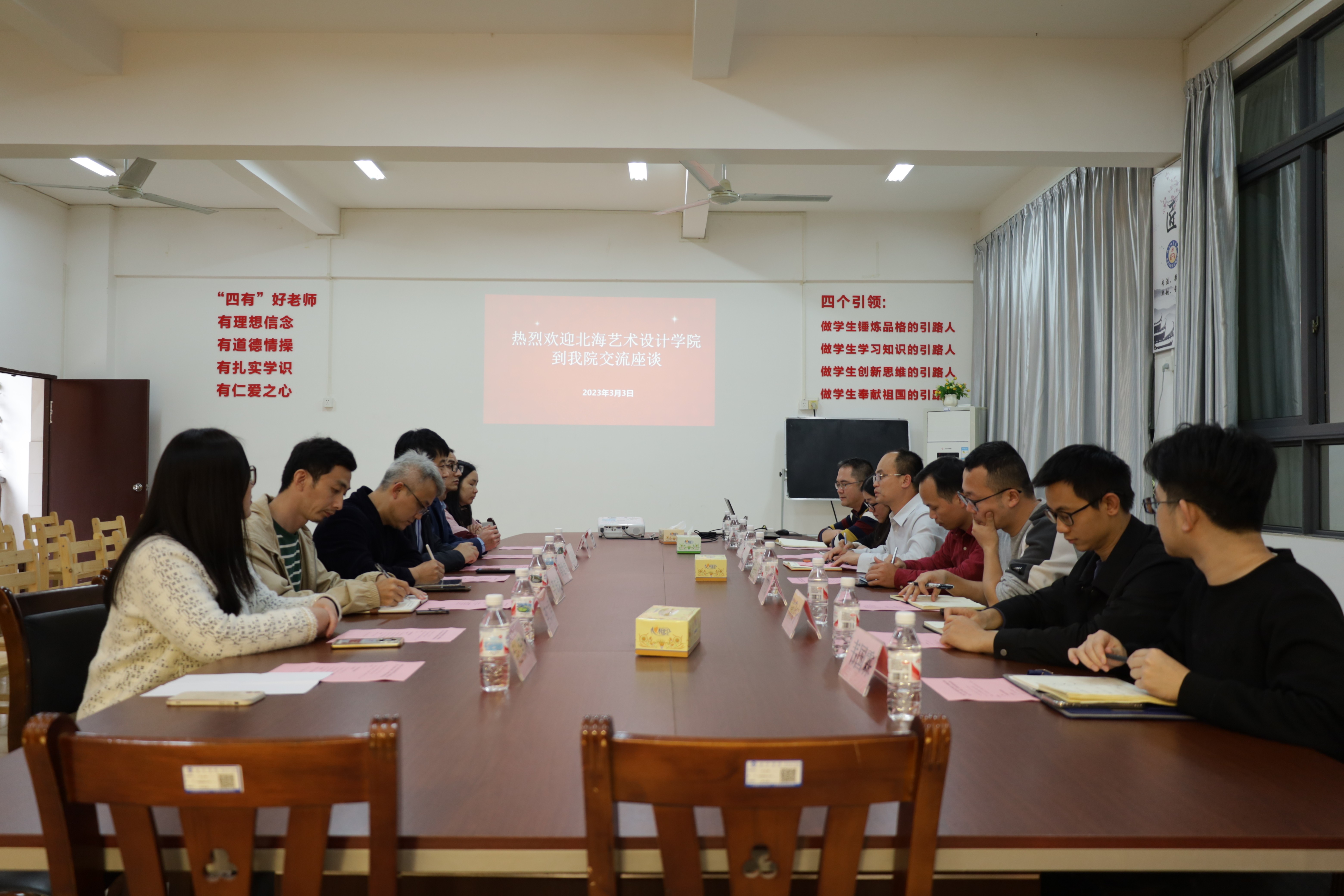 王照伟院长对南宁学院为我校调研做的周到安排表示感谢,然后交流了北艺的办学特色和优势,重点结合学校新的机遇与挑战,就学科建设、人才培养模式、教学管理、制度建设、实践教学等方面双方进行深入探讨和交流。