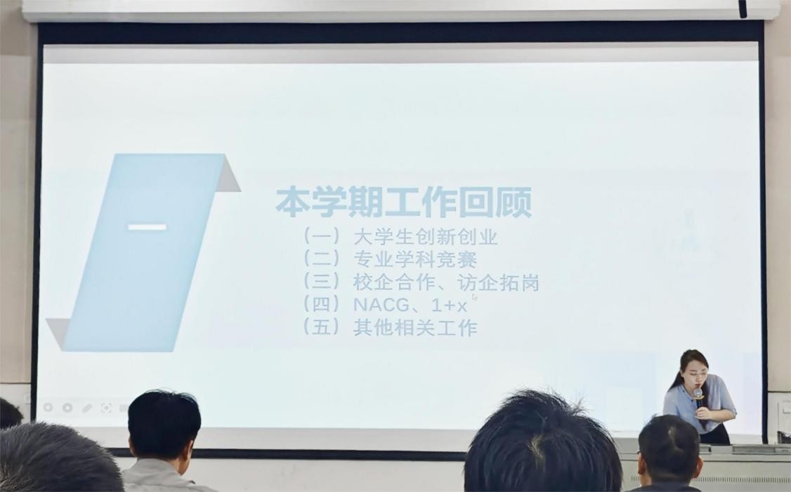 产业学院办公室汇报了创新创业与学科竞赛取得的成果,大创项目、学术成绩突出,同时明确未来将提升成果质量、增强学生竞赛信心作为工作重点。