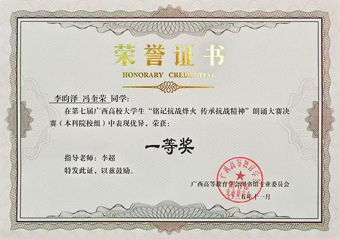 近日,第七届广西高校大学生朗诵大赛现场决赛在南宁师范大学明秀校区文星楼301报告厅圆满落幕。传媒艺术学院2024级播音与主持艺术专业学生李昀泽、冯奎荣携作品《在欢呼的人群中》斩获一等奖,指导老师李超荣获“优秀指导教师奖”,为学校再添荣誉。