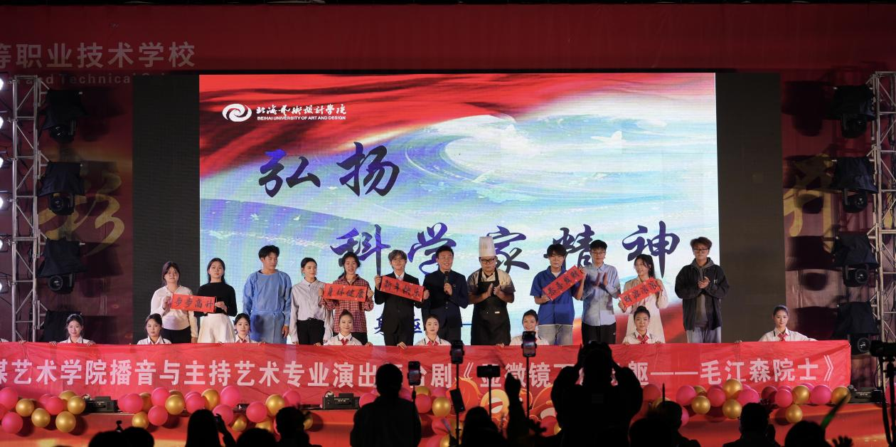 2025年12月30日晚,传媒艺术学院原创多幕情景舞台剧《显微镜下的身躯——毛江森院士》首次走出校园,在北海市培正数字中等职业技术学校田径场成功上演。演职团队以专业姿态演绎科学家精神,为培正职校师生呈现了一场沉浸式思政艺术盛宴。