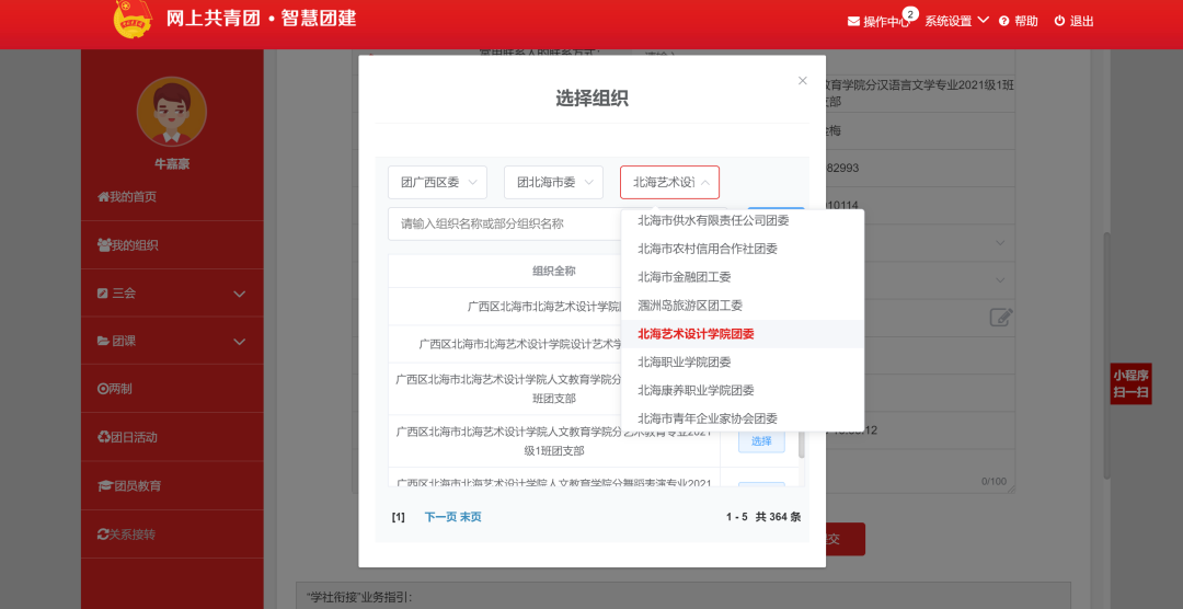 2.转入组织是否属于北京/广东建:选择“否”。转出原因:选择“升学”。申请转入组织:选择“团广西区委”>“团北海市委”>“北海艺术设计学院团委”,搜索班号,选择所属班级团支部。