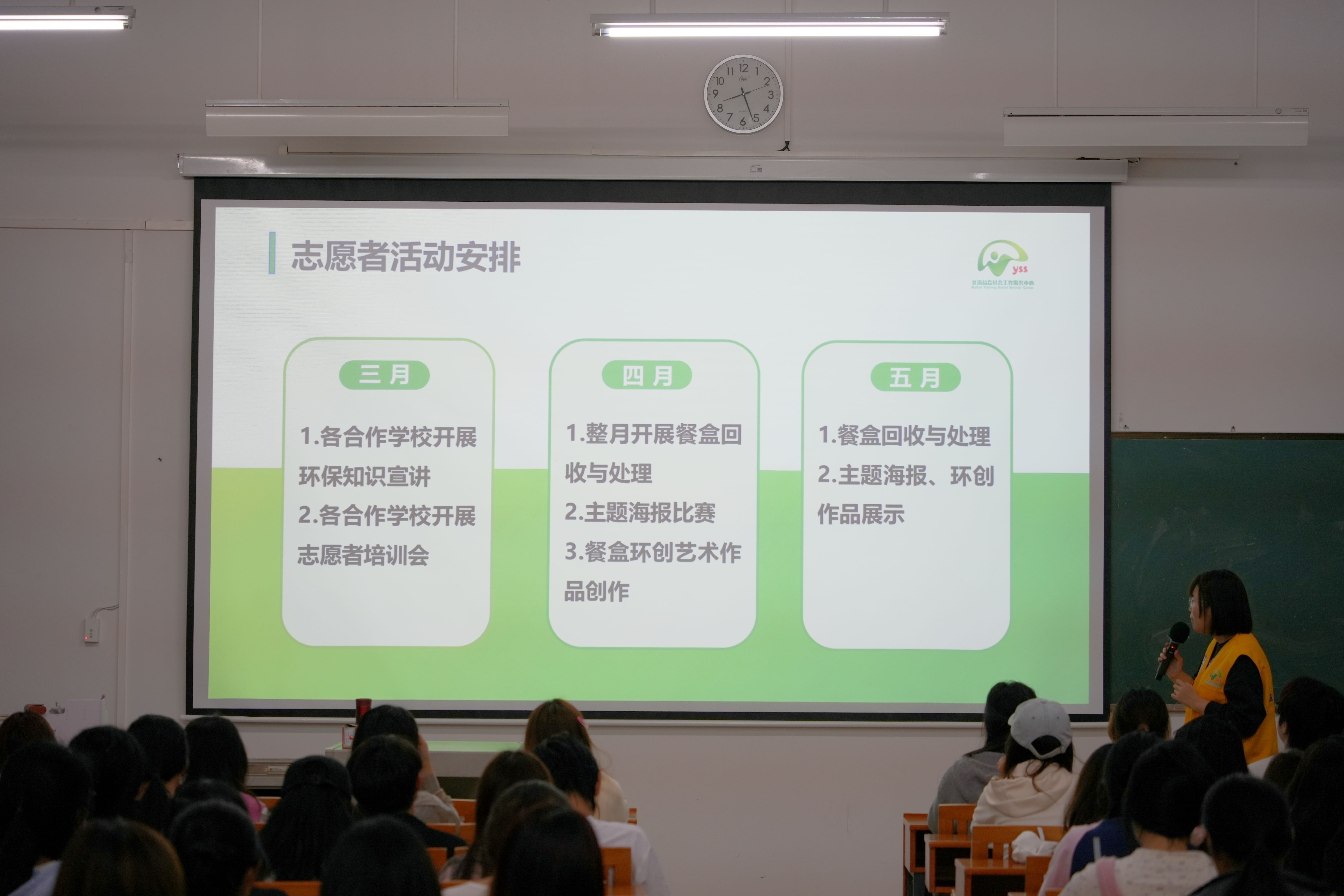 在志愿者培训环节,服务中心老师向学生们介绍了志愿者工作要求及活动拍照要求等,通过志愿者的宣传从而让更多学生加入到保护环境的具体实践中来。
