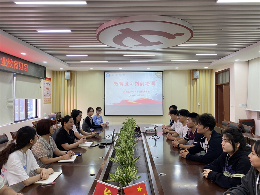 人文教育学院学生抵达北海艺术设计学院附属学校后,该校校长包玉红和副校长陈春华为教育见习的学生开展了教育见习岗前培训,介绍学校学生与班级的基本情况,同时也对我校教育见习的学生提出了教育见习期间的规定与要求。